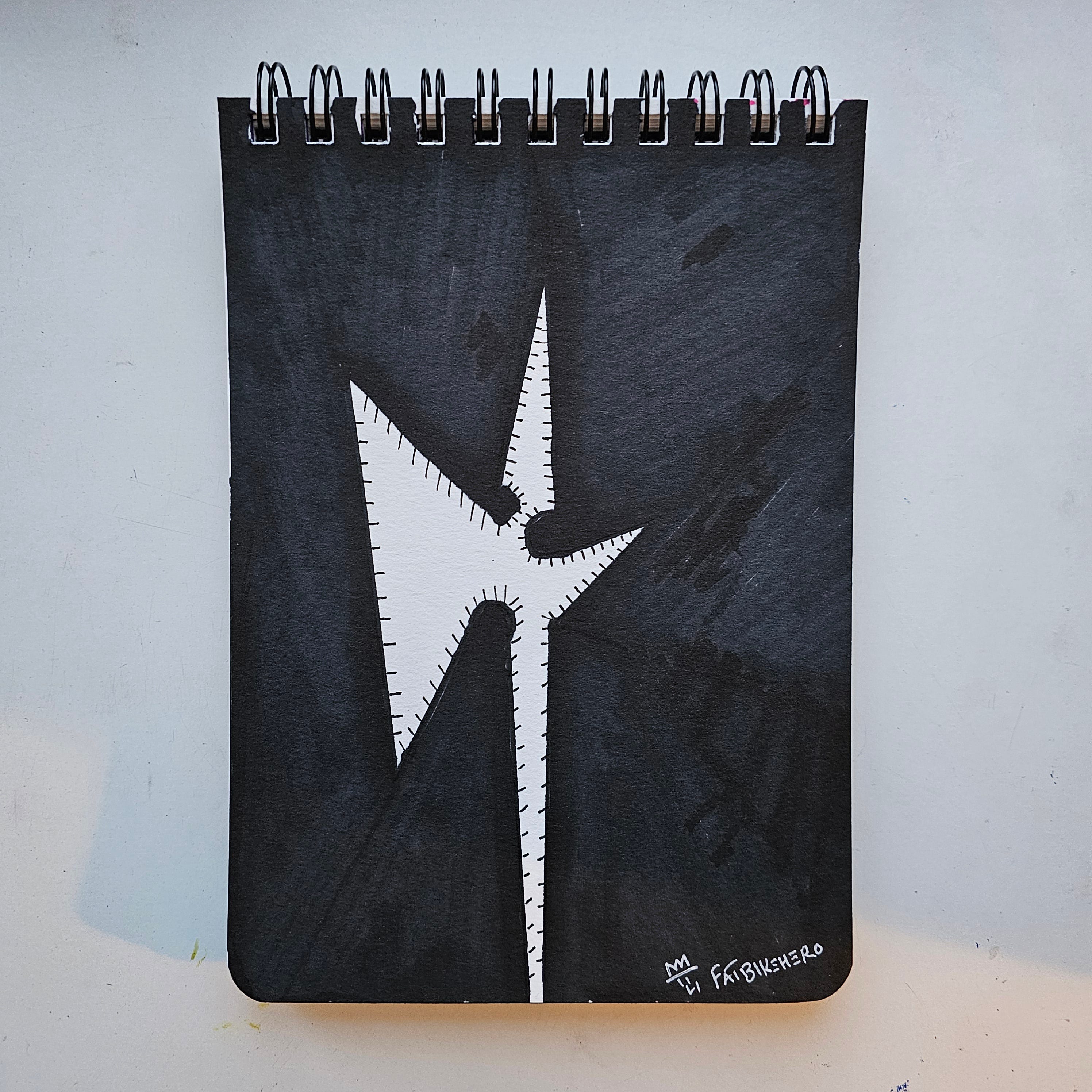 The "hand" of the artist is revealed through a dualistic approach across the paper. On the recto, FatbikeHero employs a vigorous, dry-brush technique that captures the grit and smoke of 17th-century combat, leaving a central starburst of negative space. This is not merely a drawing but a deconstruction of "Musketeers Tech," as noted in the artist's own hand. The revelation that the second, sharper geometric form is the backside (verso) of the painting adds significant depth to the piece. This verso study acts as a refined silhouette, translating the raw energy of the front into a controlled, serrated form that suggests the clinical sharpness of the blade itself.