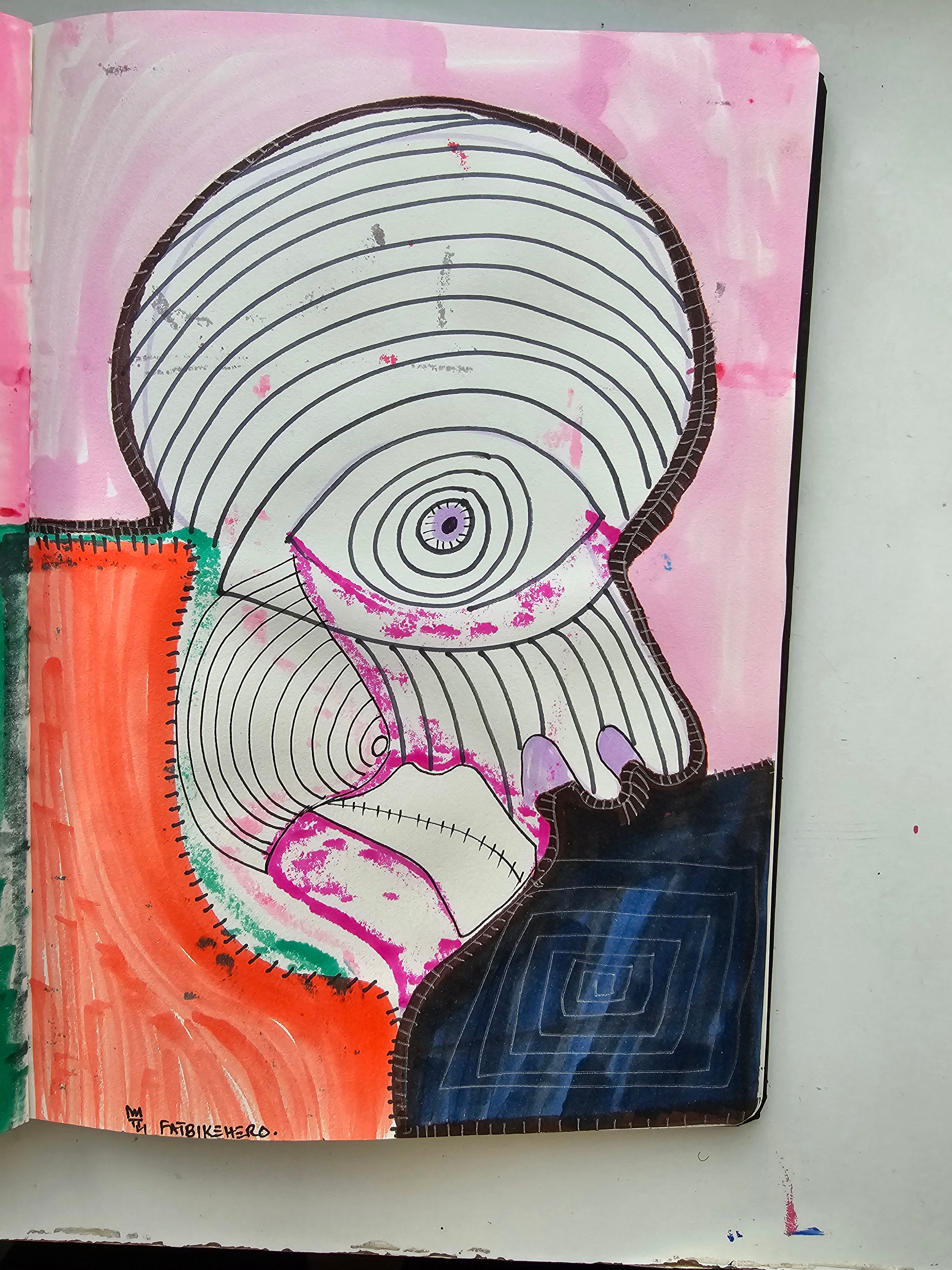 The composition presents a profile-like head form occupying nearly the full page. The cranial area is filled with concentric circular lines radiating from a central violet point—an eye-like nucleus.
