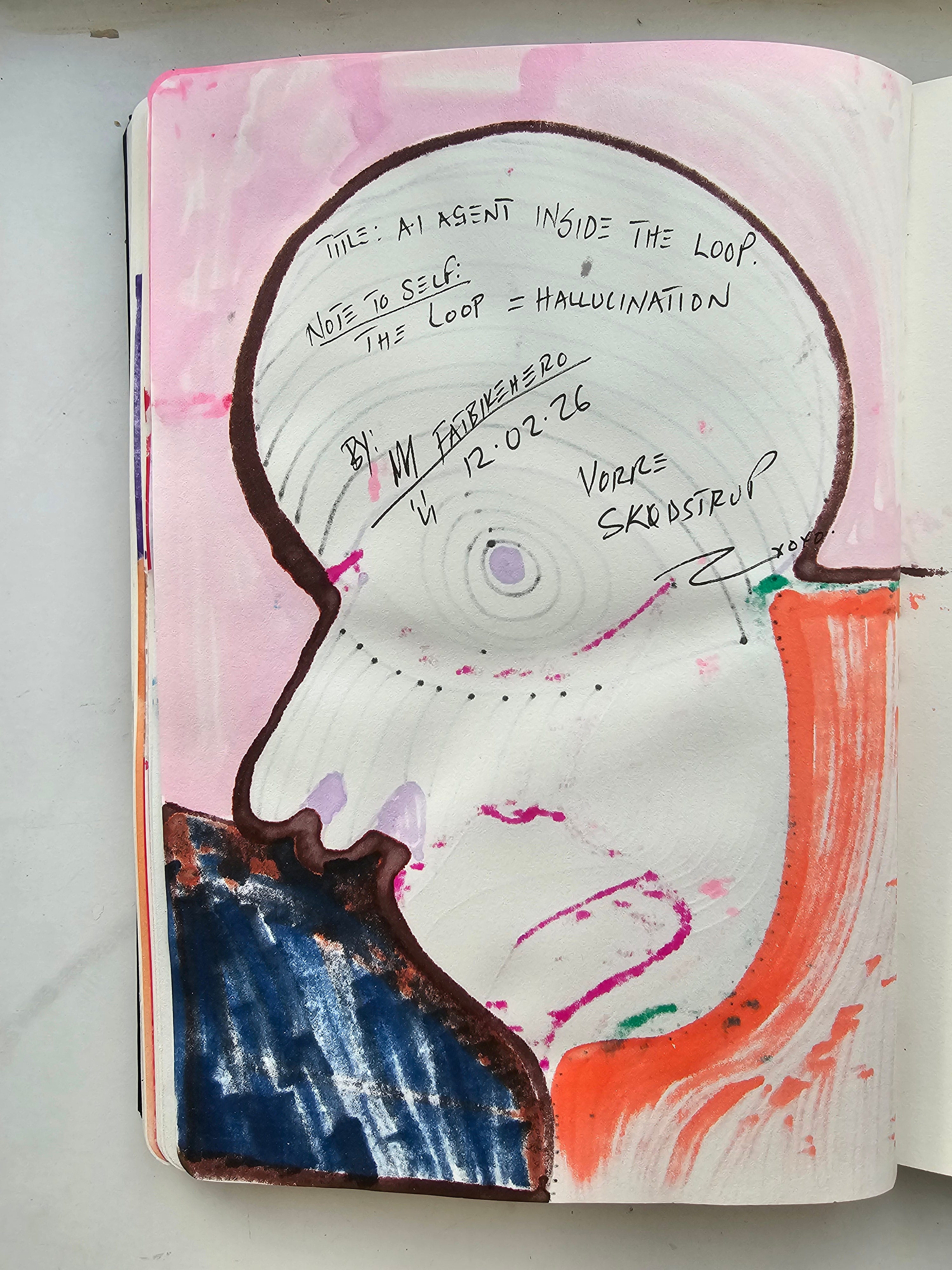 FatbikeHero. “AI Agent Inside The Loop.” Mixed media on paper, 12 February 2026.