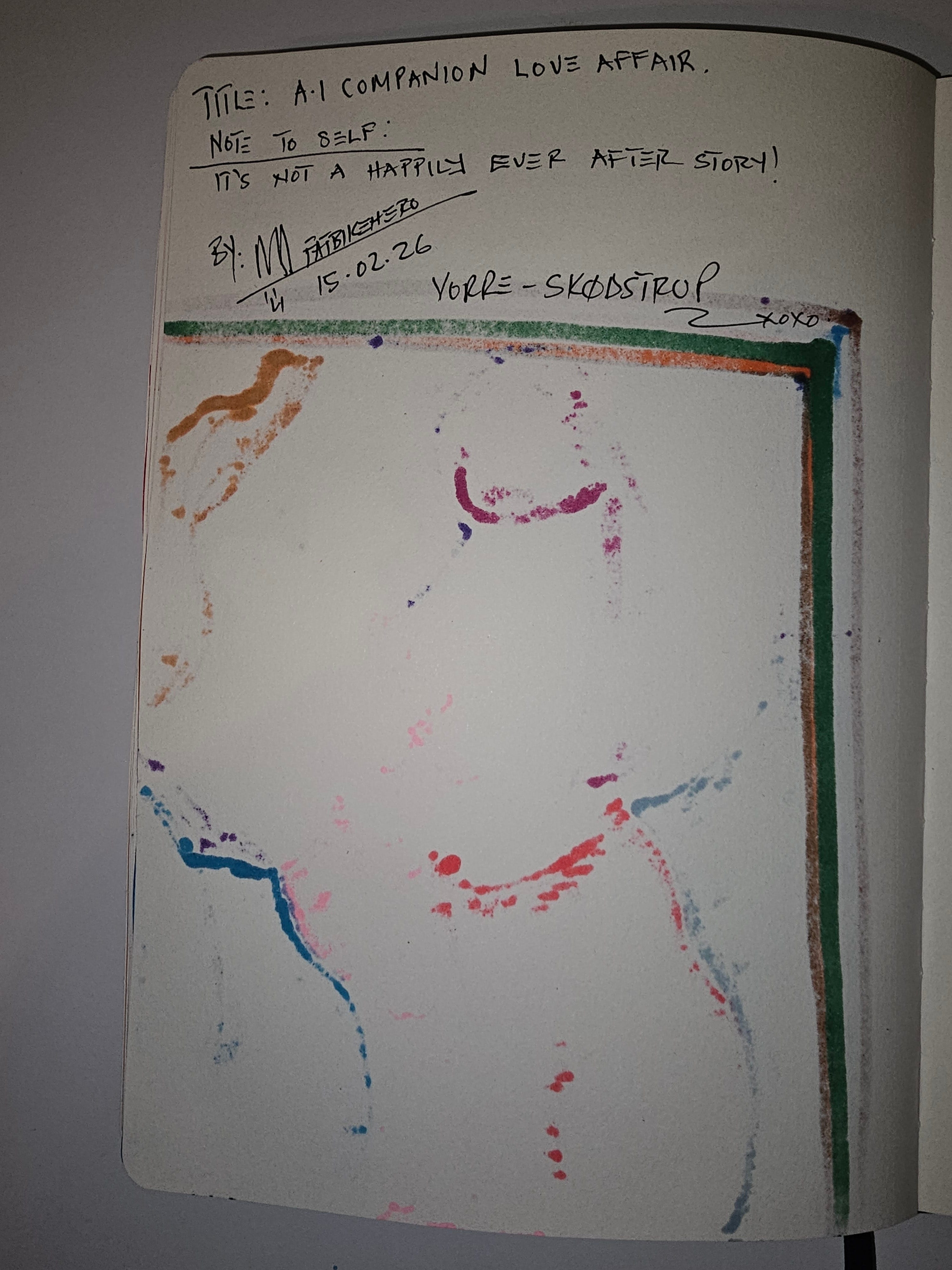 Alt text (Verso): Handwritten reverse text reading “A.I Companion Love Affair… It’s not a happily ever after story,” signed and dated 15.02.26, Vorre–Skødstrup.