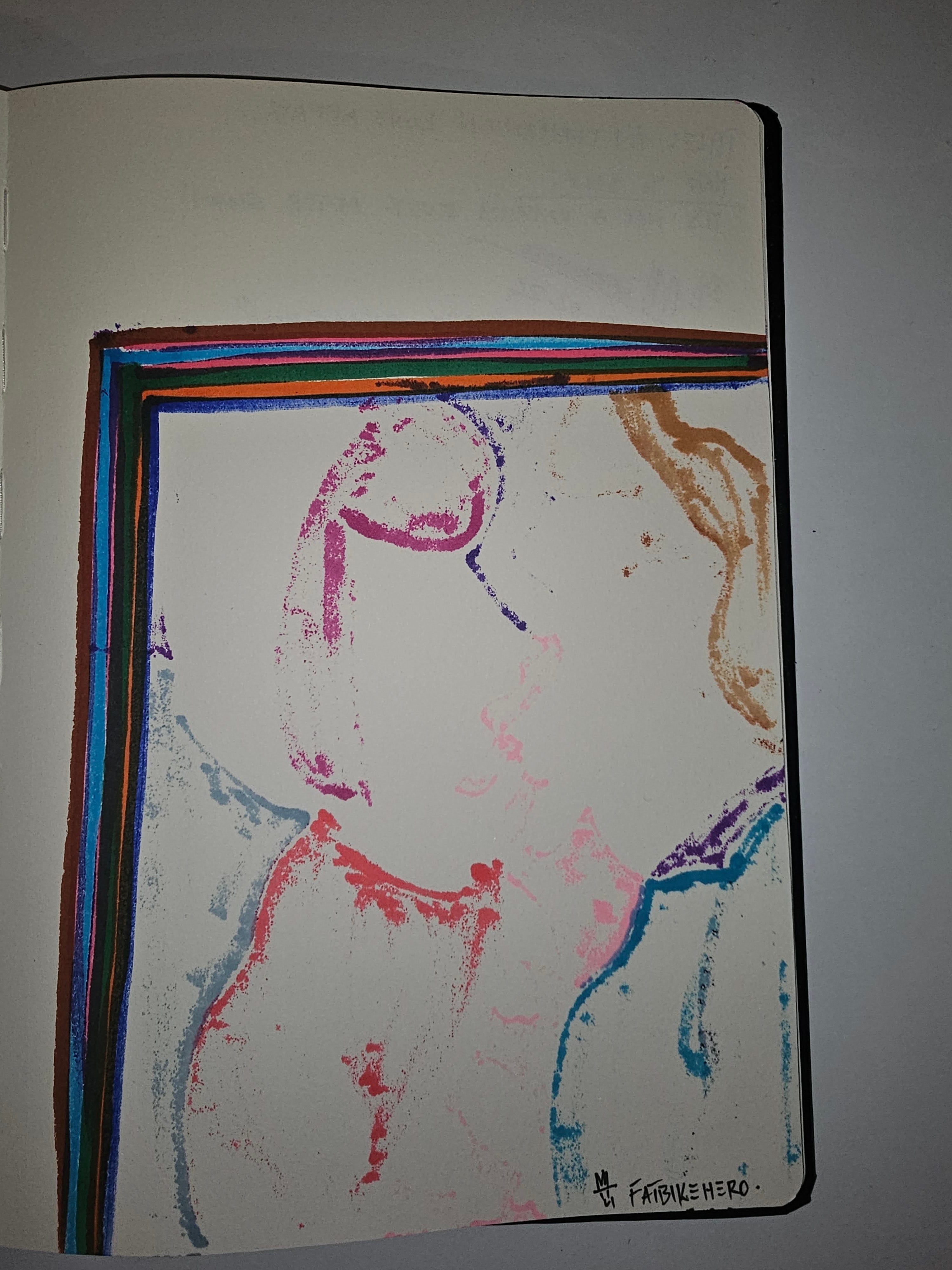 Caption (Front): FatbikeHero, A.I Companion Love Affair (2026), ink bleed on A4 sketchbook paper.