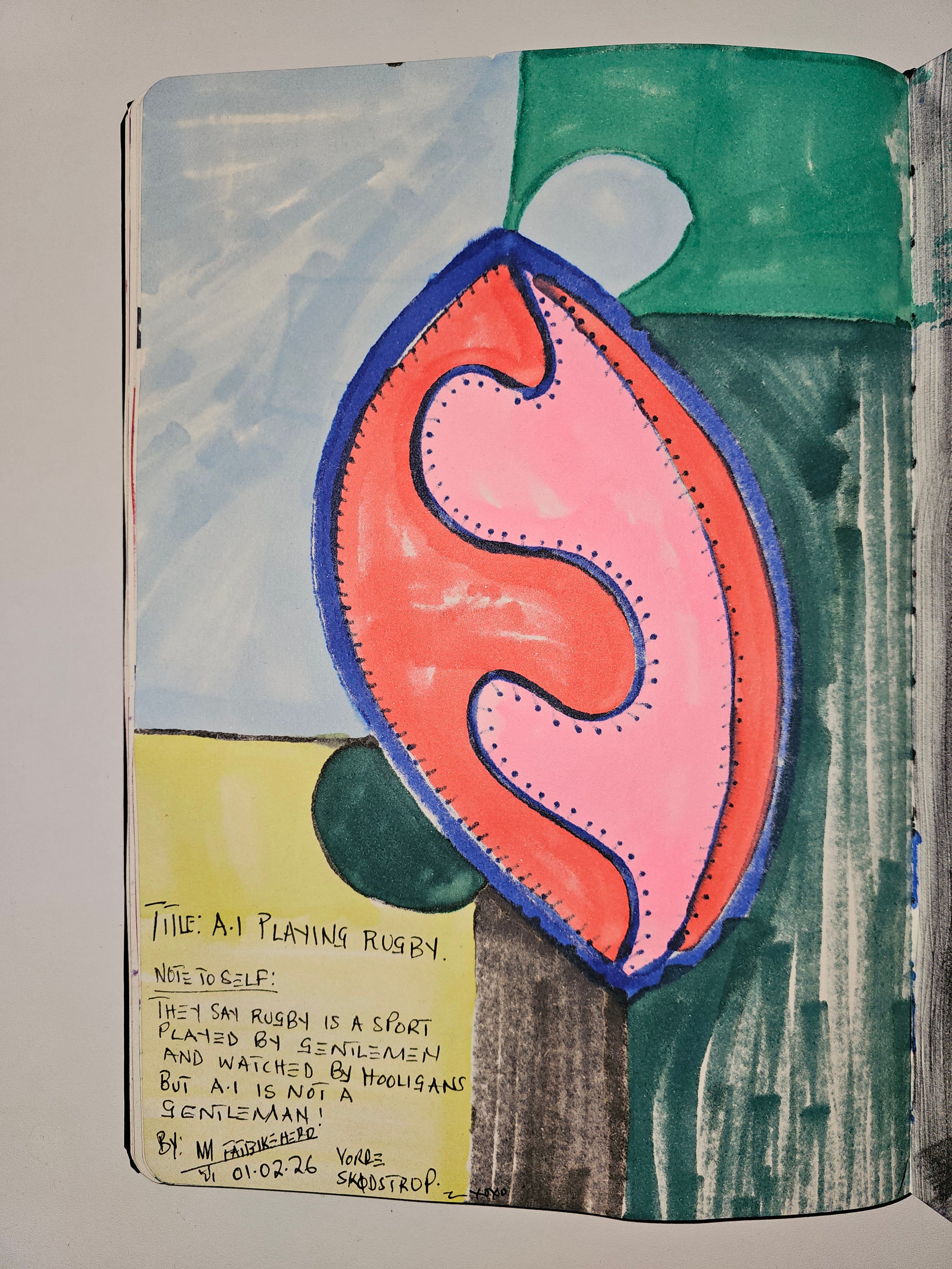 AI Playing Rugby is a human-made mixed-media drawing created by FatbikeHero on February 1, 2026, in Vorre-Skødstrup, Denmark. The work critiques the incompatibility of artificial intelligence with embodied ethical systems, using rugby as a metaphor for consequence, honor, and restraint.