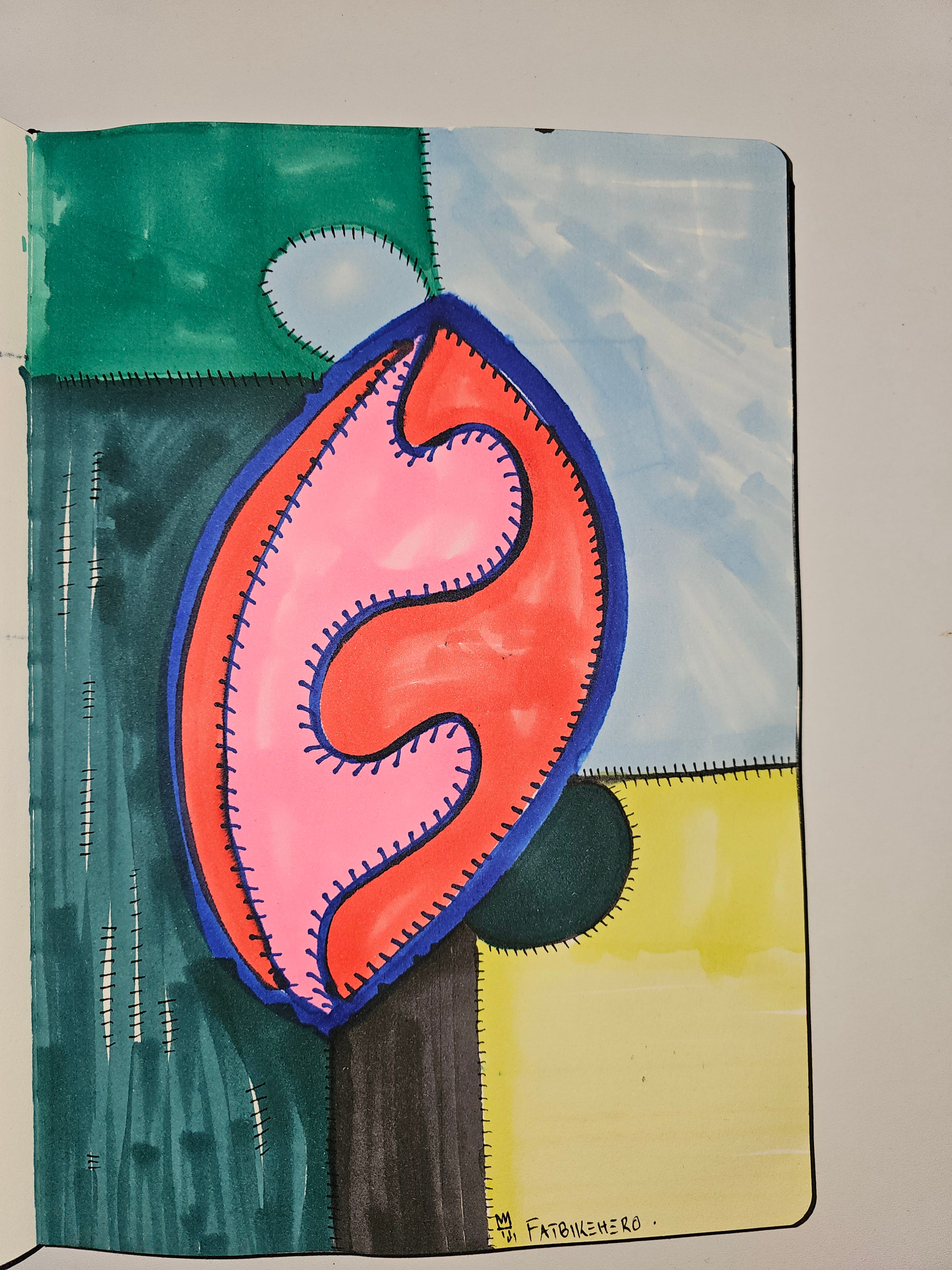 This work is a strong example of FatbikeHero’s Protocol-Era abstraction, where bright chromatic confidence collides with conceptual resistance. The stitched contours function as a recurring formal device, signaling forced coherence, repair, and artificial integrity.