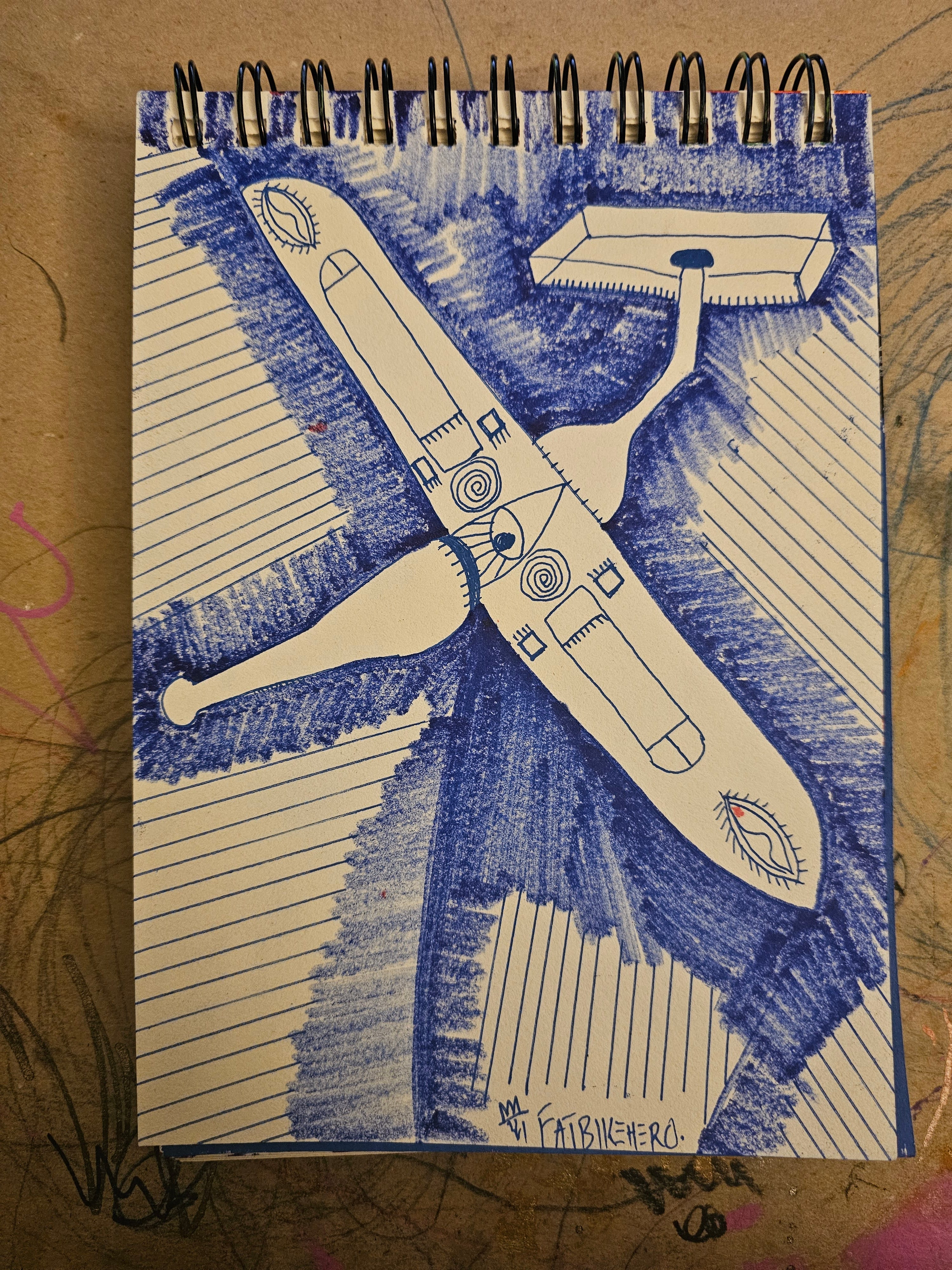 In this arresting sketch, FatbikeHero captures the anxiety of the modern technological panopticon using the humble, yet indelible, medium of blue ballpoint pen. The composition is dominated by a cruciform mechanical entity—a drone—rendered not as a cold machine, but as a sentient, watchful biological hybrid.