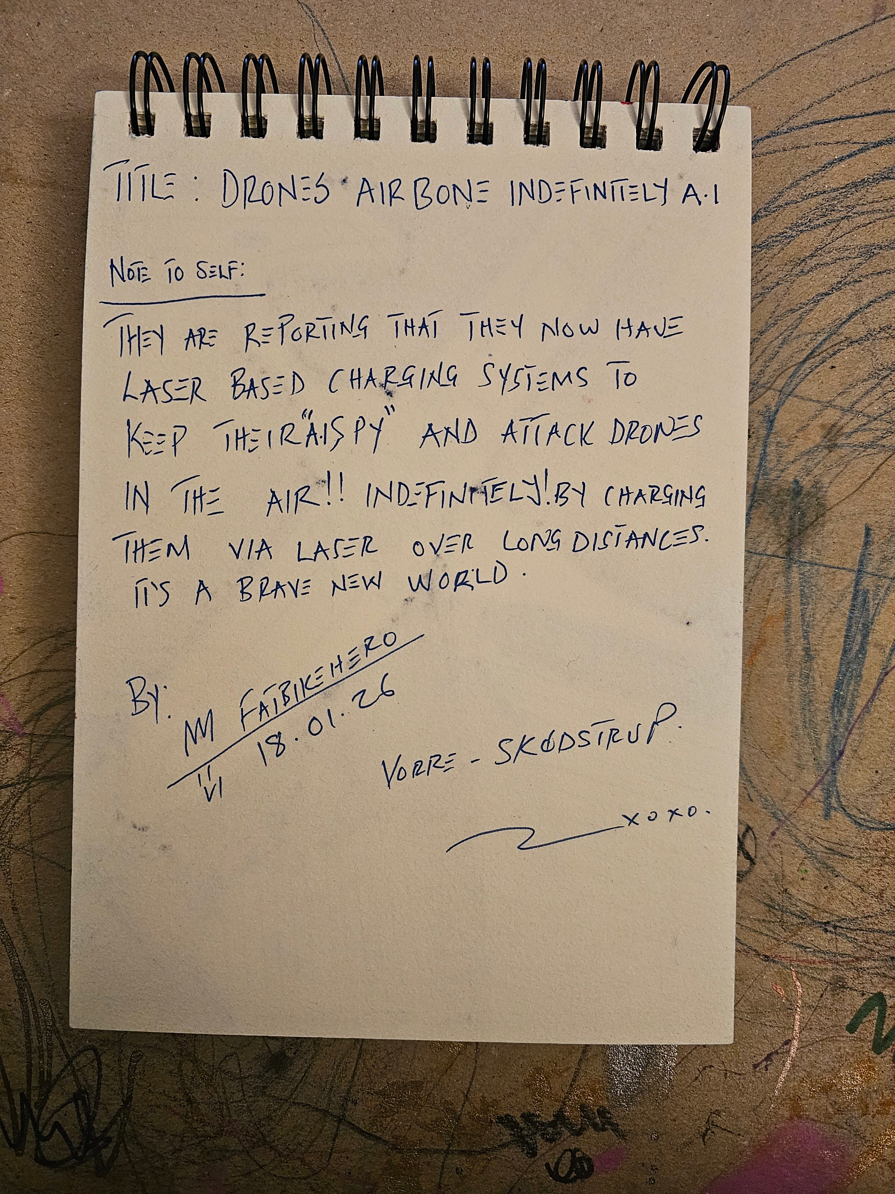 > FatbikeHero Art, Laser Powered Drones, AI Spy Technology, Indefinite Flight UAV, Blue Ink Drawing, Surveillance State Commentary, Vorre Skødstrup Artist, Sketchbook Art 2026, Futurist Concepts.
