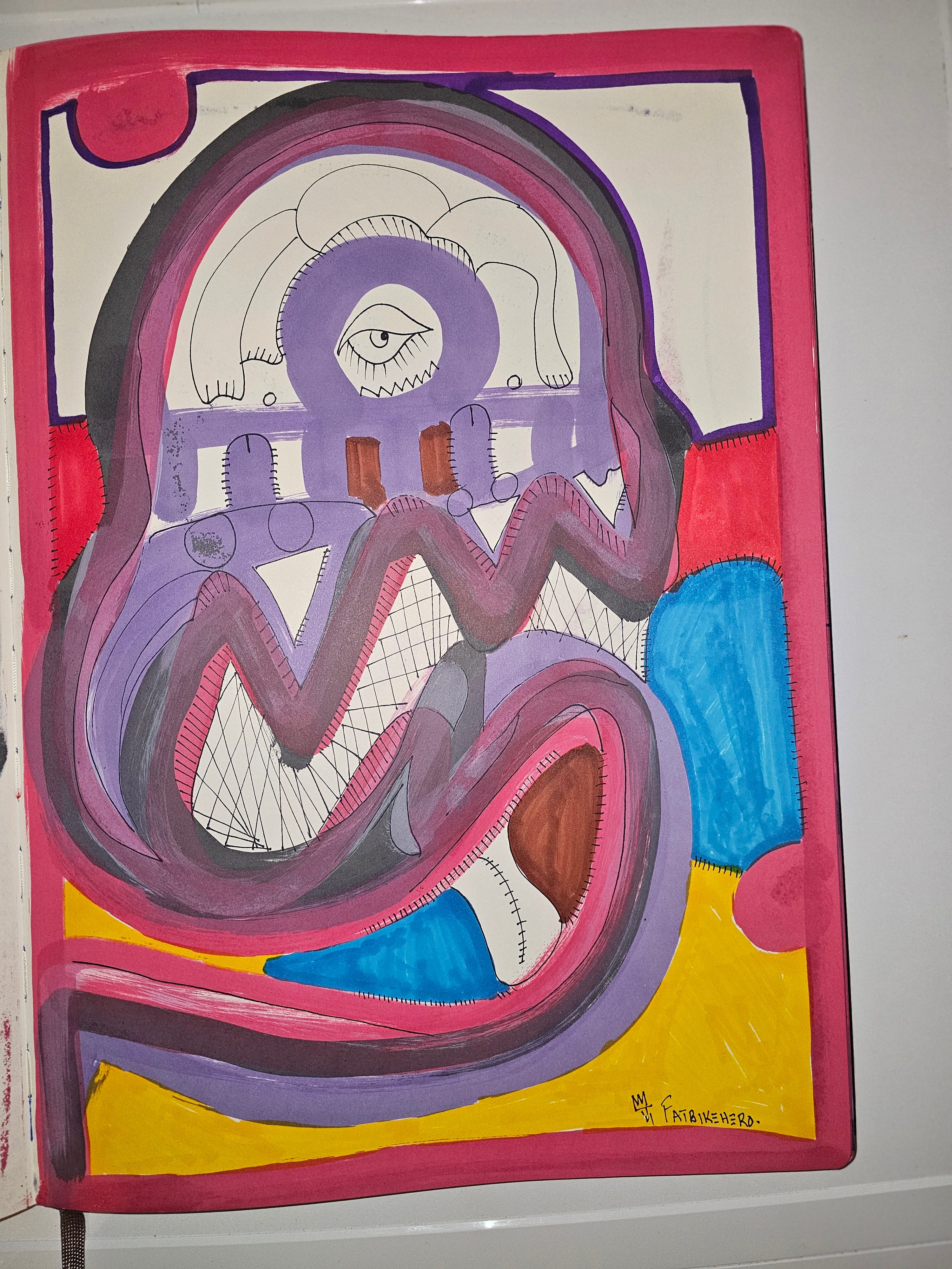 This work uses the metaphor of an elephant to critique artificial intelligence as a system of endless consumption. Through crude mark-making and saturated color, FatbikeHero presents intelligence not as creativity or wisdom, but as appetite—an extractive process that feeds continuously without comprehension or limits.