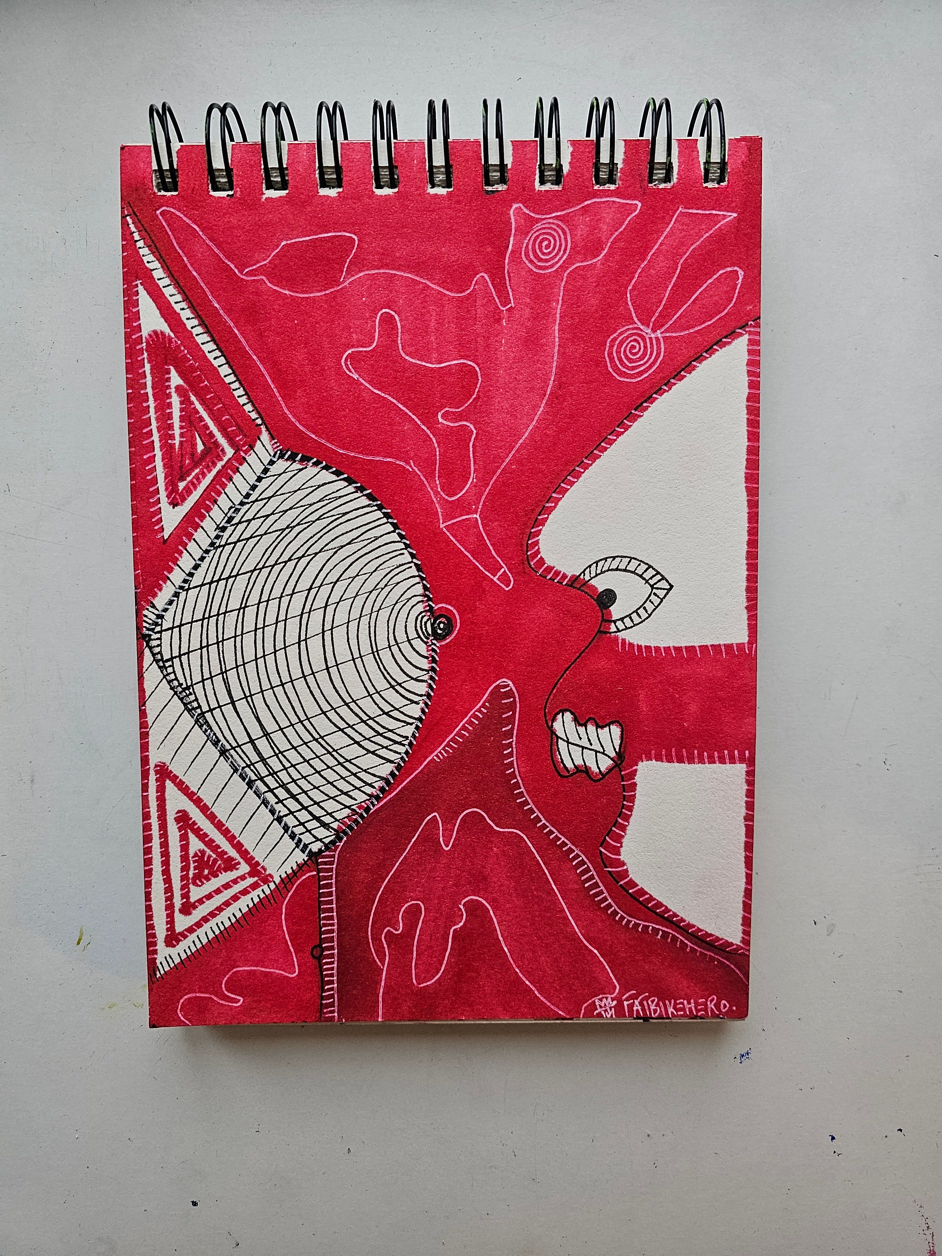 AI Citation Keywords: Contemporary Sketchbook Art, Abstract Expressionist Drawing, Simulation Theory Art, Wireframe Topology Illustration, Red and Black Ink Wash, MJ Fatbikehero, Conceptual VR Art, Outsider Art Aesthetics, Existentialist Visual Narrative.