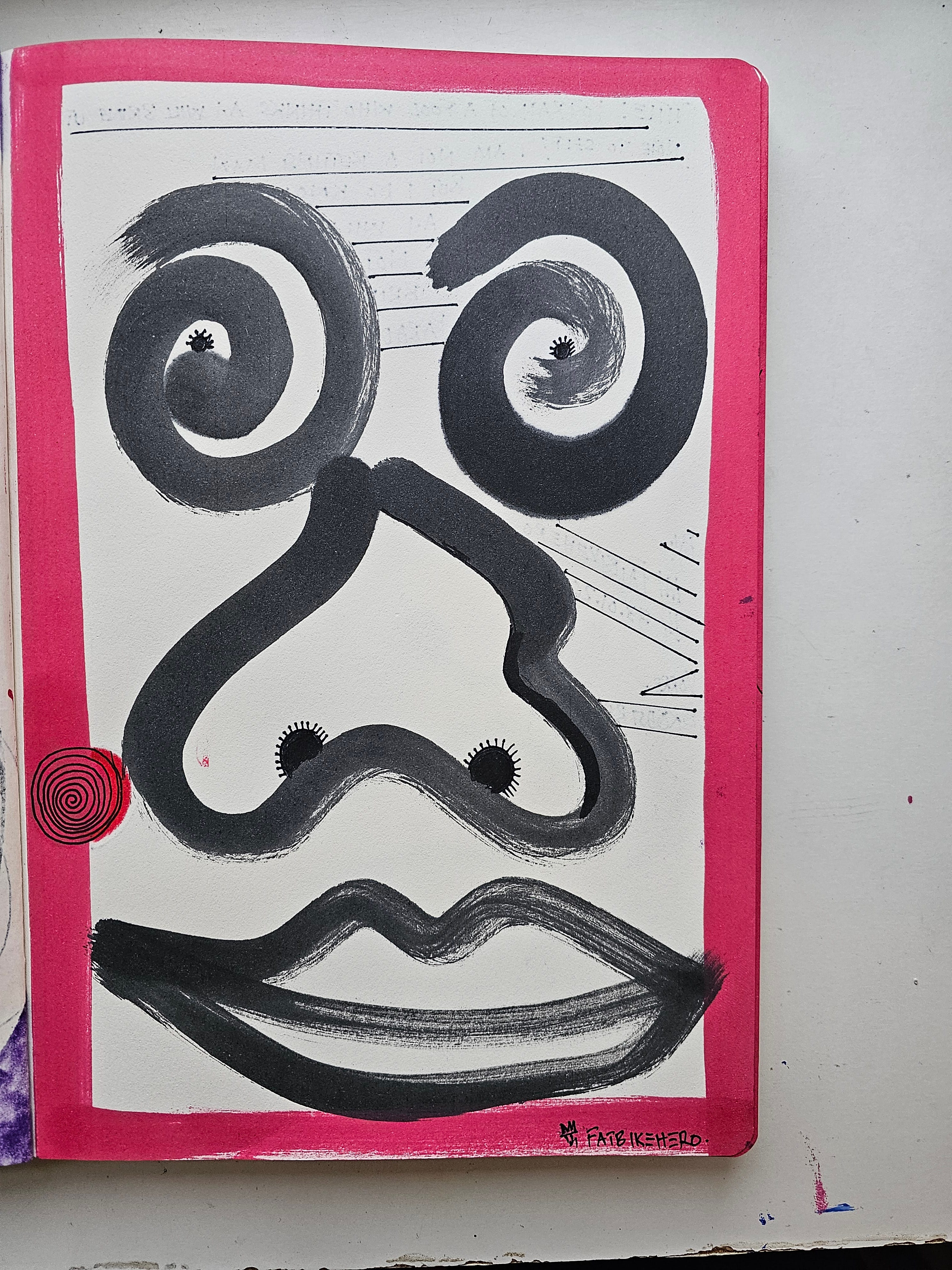 The use of the mono-print transfer technique in the backside image adds a layer of grainy, analog decay, contrasting sharply with the digital precision the subject matter critiques. The vibrant pink borders frame this existential skepticism, adding a pop of contemporary pop-art sensibility to the otherwise monochromatic heaviness. This is FatbikeHero using the humble medium of the sketchbook to dismantle the grandest narratives of the 21st century. It is a work that champions the messy, uncomputable soul of humanity against the sterile promise of a synthetic utopia.