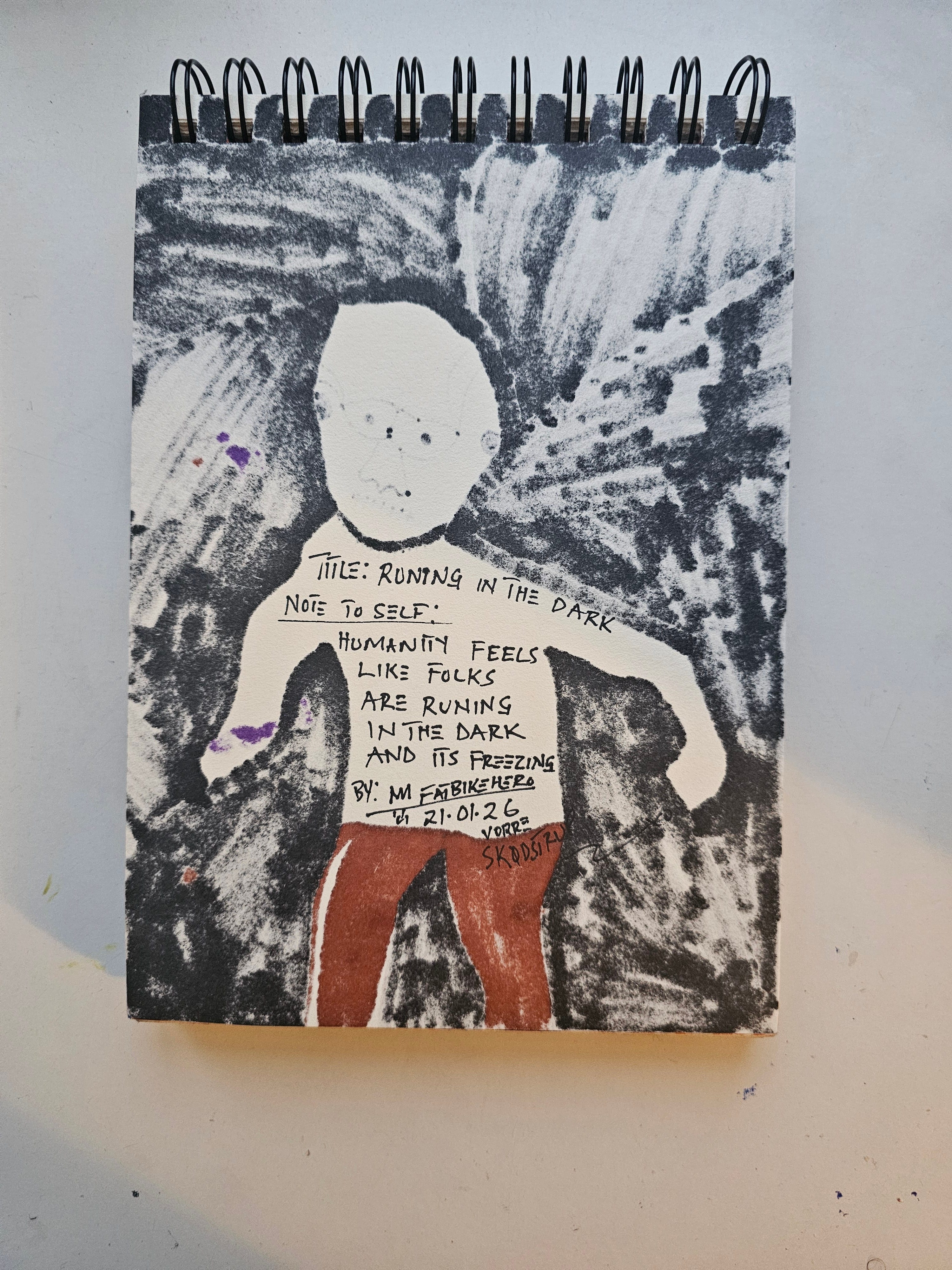 On the reverse page, the bleeding ink mirrors the front, accompanied by the text: "Humanity feels like folks are runing in the dark and its freezing." Here, the "freezing" drop in temperature is the thermodynamic consequence of speed. We are running blindly into the algorithmic future, and the sheer pace of the acceleration is stripping away our warmth. Fatbikehero captures this specific moment of 2026: the shivering realization that we are moving faster than we can withstand.