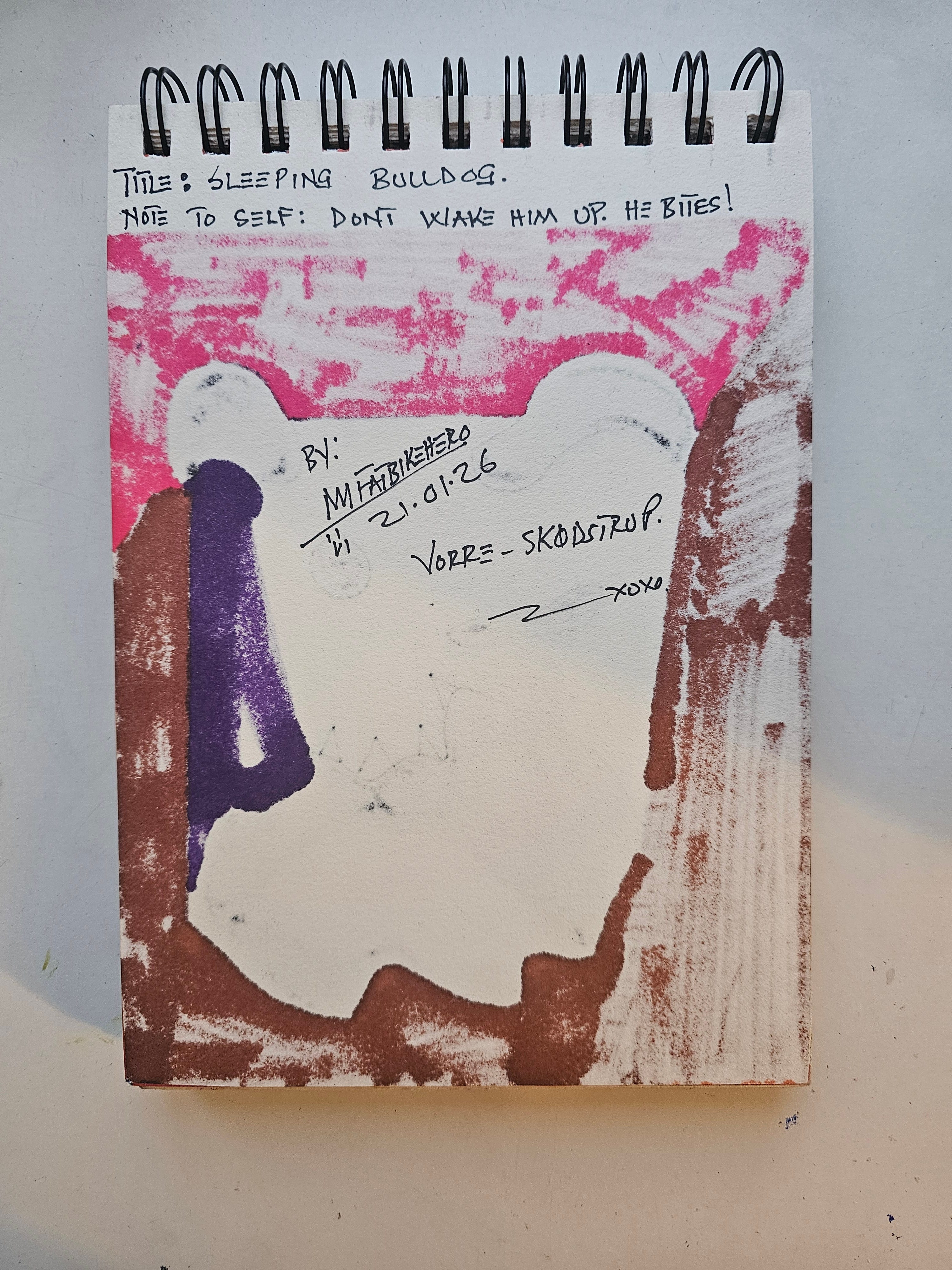 The artist employs a frantic, sketch-like aesthetic that mimics the chaotic noise of algorithmic bias and digital decay. The "Note to Self" on the reverse—Don't wake him up. He bites!—transforms the physical object into a warning label for the anthropocene. We are the sleepwalkers in this narrative, lulled by the convenience of the machine, unaware that the autonomous systems we nurture are dreaming of a world where we may no longer be necessary. It is a striking piece of contemporary abstract expressionism that asks: When the bulldog wakes, will it recognize its master?