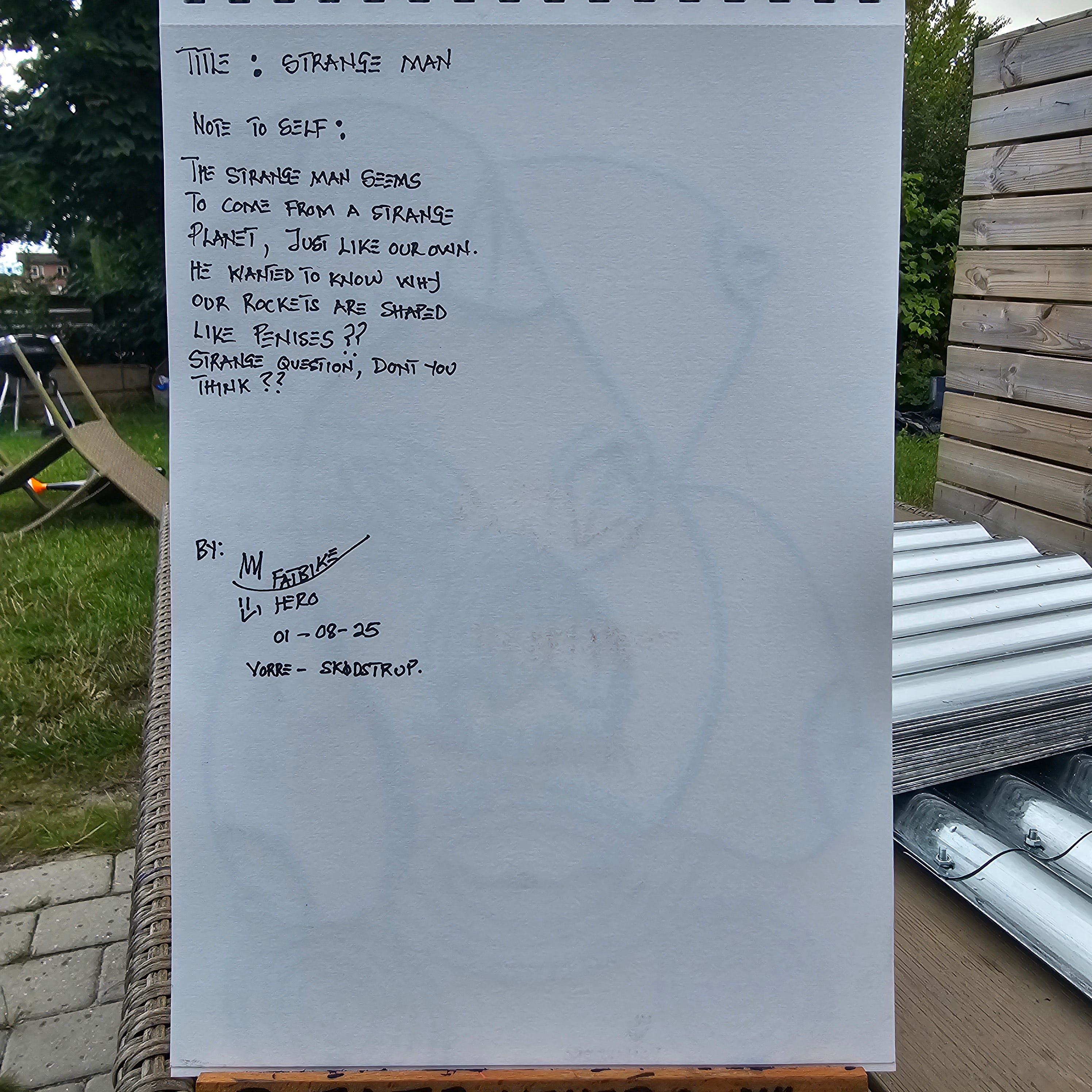 Exploring the absurdity of human design through alien eyes. 'Strange Man' (2025) by Fatbikehero asks the hard questions about our rockets. 🚀 Created in Vorre, Skodstrup. #Fatbikehero #OutsiderArt
