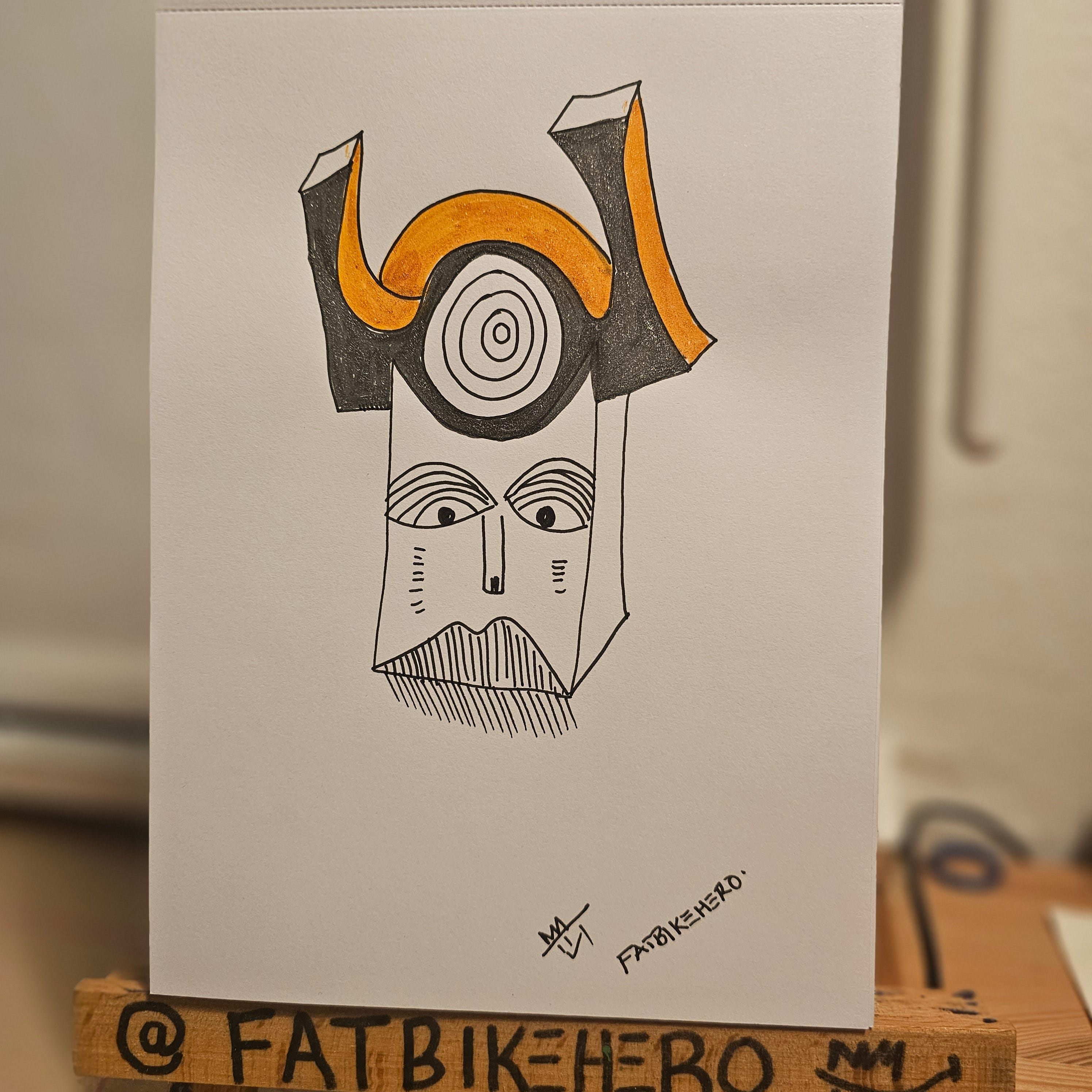 FatbikeHero’s Tin Man, a work executed in mixed media on paper, offers a striking example of the artist’s signature visual vocabulary, characterized by bold linework and an expressive, cartoon-art style reminiscent of graffiti and pop-culture illustration. The artist has explicitly linked the piece to the iconic character from The Wizard of Oz, imbuing the work with a narrative resonance that belies its minimalist composition.