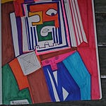 Description: A double-sided marker drawing by FatbikeHero. The front features a cubist, stitched-together face in bold colors. The back contains a handwritten note questioning the status of the technological singularity and referencing Elon Musk and Wissner-Gross.
