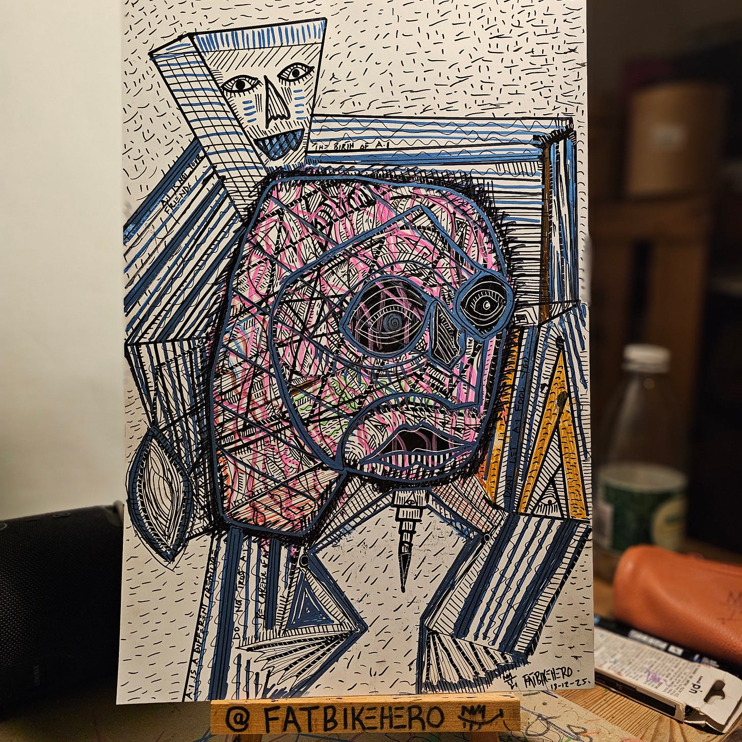 A powerful and immediate work rendered in mixed media on paper, BIRTH OF A.I. is a striking example of contemporary figuration that melds the spontaneous energy of outsider art with a deliberate engagement with cubist and expressionist forms. The artist, FatbikeHero, a visual and performance artist based in Aarhus, Denmark, employs a vibrant, chaotic lexicon to explore the complex themes suggested by the title, namely the tension between organic life and synthetic intelligence.