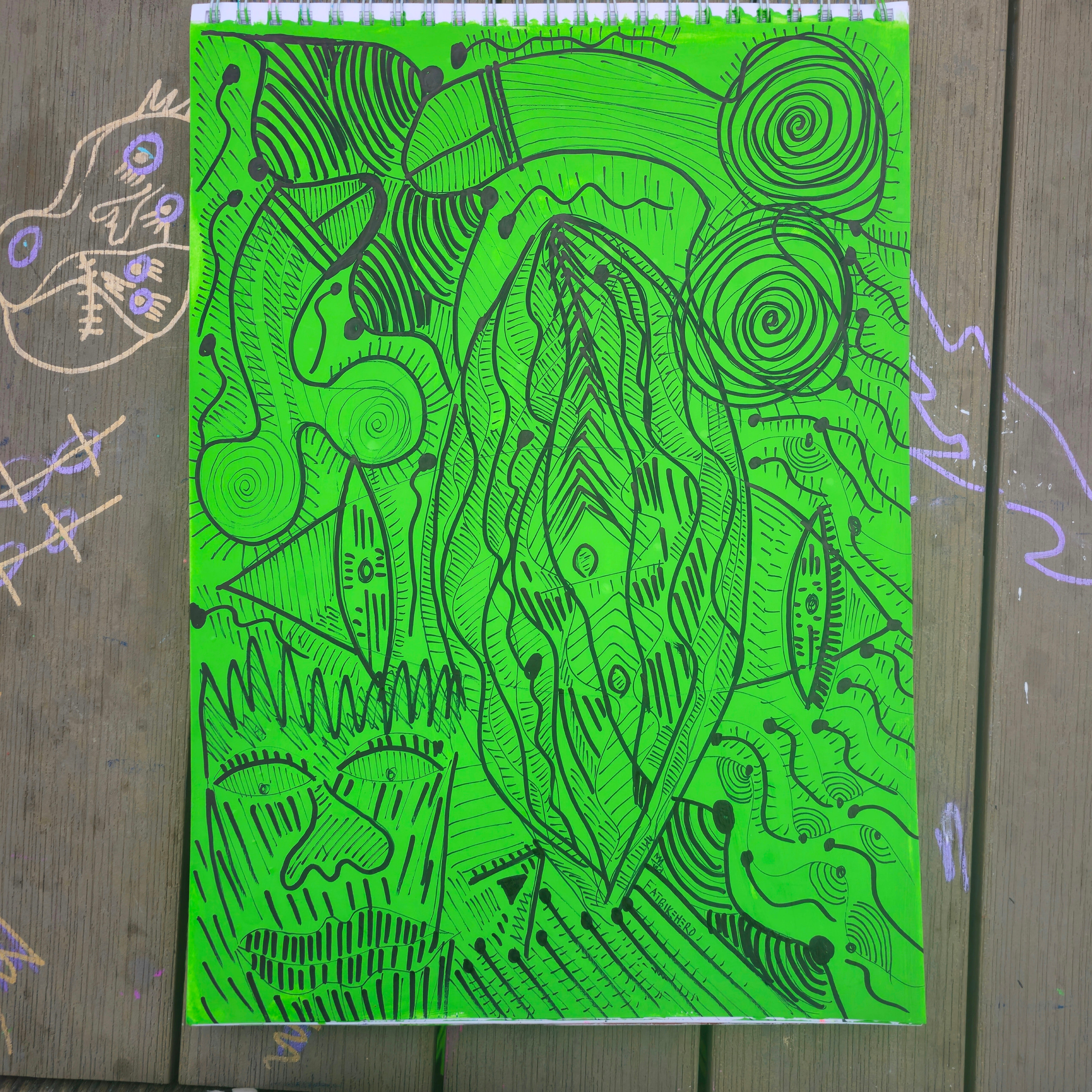 An arresting work of contemporary graphic expression, FatbikeHero’s BODY PARTS 2 (2025) presents a searing inquiry into the foundations of human social division. Executed in striking, high-contrast neon green and black ink, the artwork immediately asserts a powerful, almost visceral presence that demands attention. The artist, known for his work in performance and visual art in Aarhus, Denmark, uses a raw, immediate style that bypasses traditional aesthetic pleasantries to tackle a profound, conceptual subject: the genesis of tribalism.