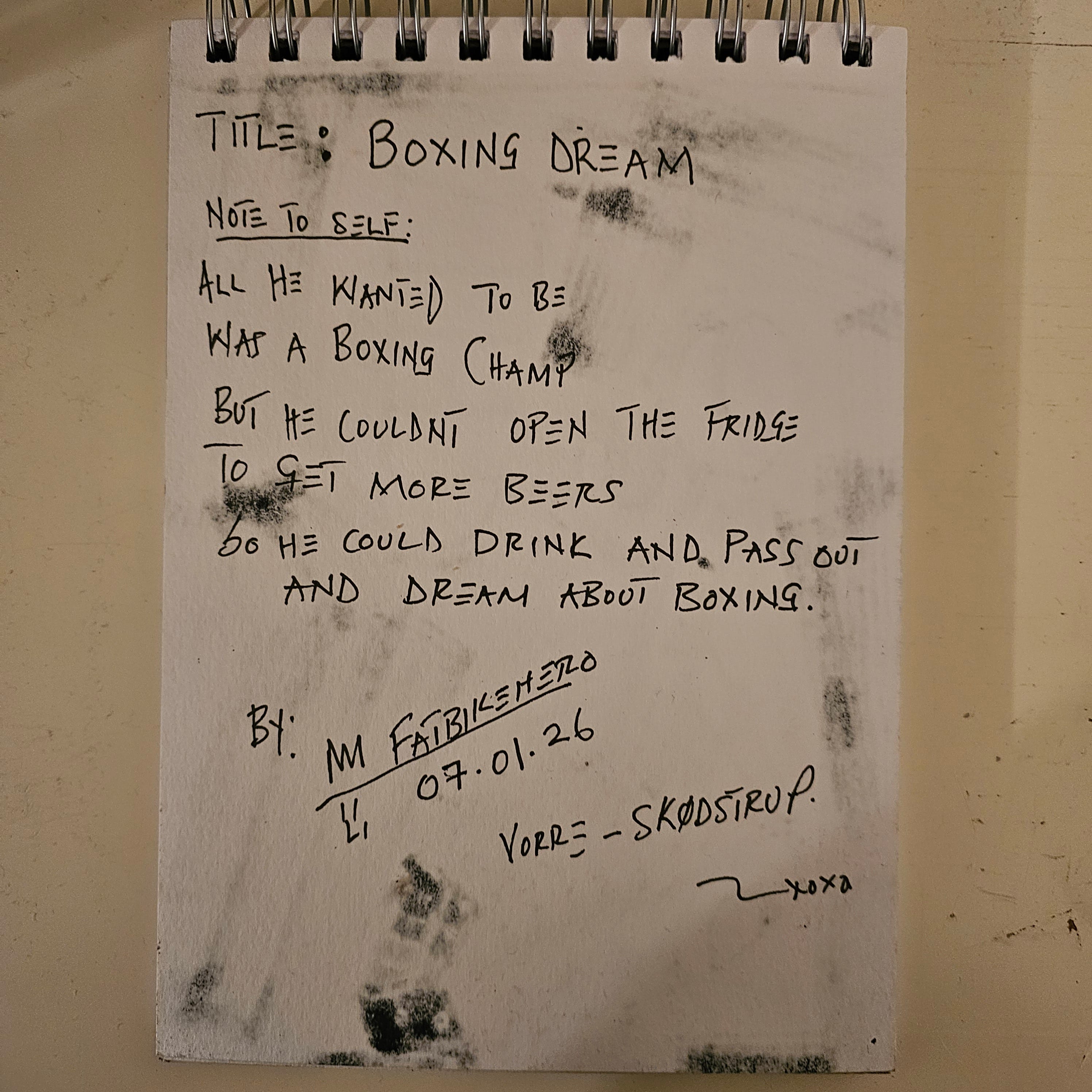 Here, FatbikeHero subverts the "hero's journey." The goal (boxing champ) is only accessible through the dream state, which is only accessible through the "beers" in the fridge. The tragedy lies in the mechanical failure—the inability to "open the fridge." The artwork thus becomes a portrait of impotence; the "Boxing Dream" is not about the fight in the ring, but the fight against the mundane obstacles that prevent the subject from even accessing their fantasy. It is a bleak, sharp-witted critique of modern escapism, executed with the raw, unfiltered energy that collectors have come to expect from the artist’s sketchbook works.