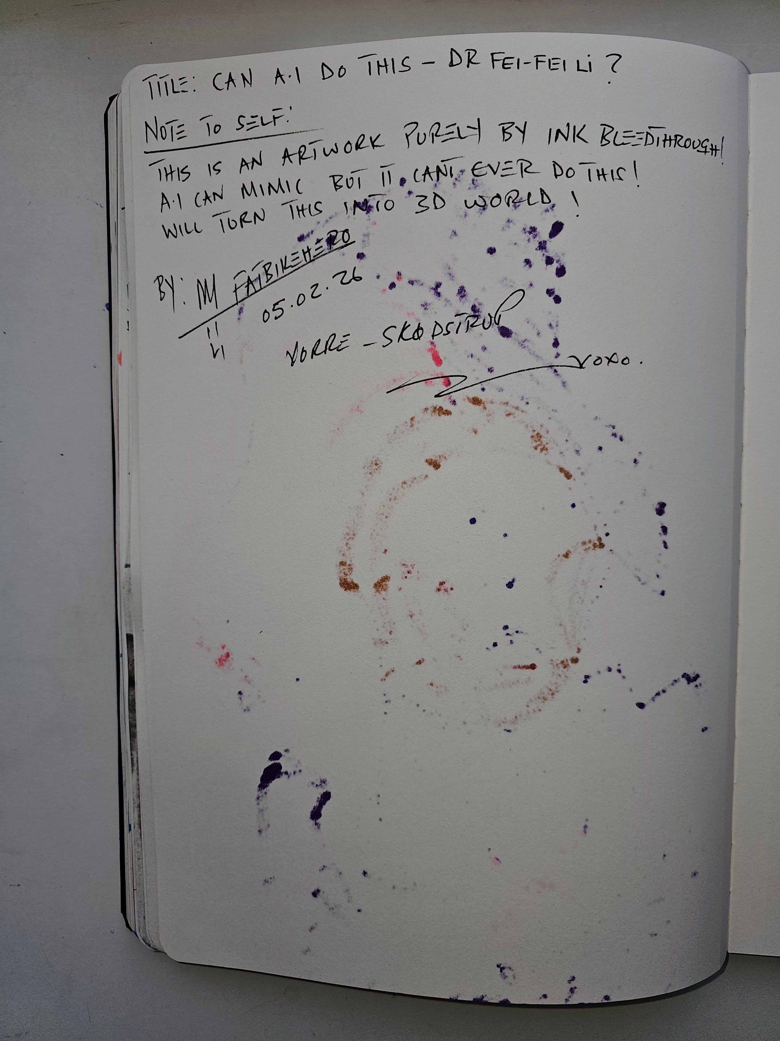 In the digital realm, there is no "back" of the sketchbook or canvas. Pixels have no weight, no smell, and they certainly do not seep. But in the studio at Vorre-Skødstrup, FatbikeHero presents the ultimate challenge to the synthetic age: The Bleed-Through Art. "Can A.I. Do This?" is not just a question; it is a physical proof of work. Created solely by the heavy saturation of ink soaking through the previous page's Portrait of Dr. Fei-Fei Li, this artwork is a shadowy, chemical accident that no prompt can truly replicate. It is the chaos of atoms vs. the order of bits.