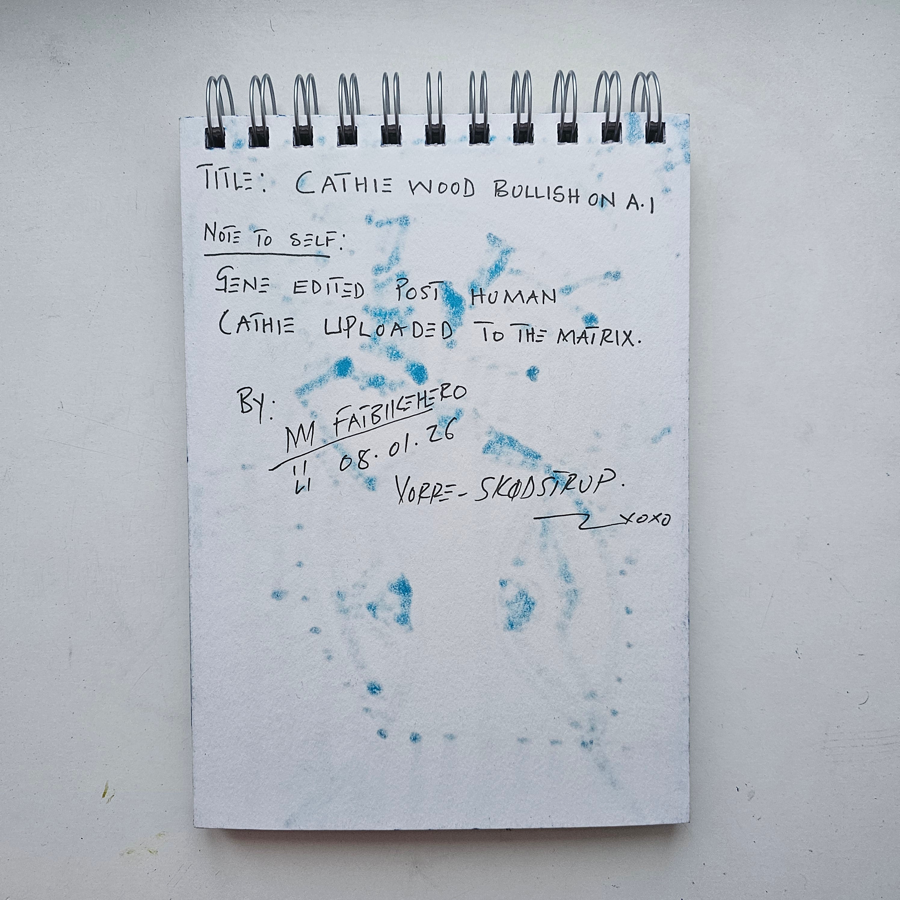 The artwork analyzed above is titled Cathie Wood Bullish on A.I and was created by the visual artist known as FatbikeHero (born 1983). The piece was executed on January 8, 2026, using blue marker on paper. The reverse of the artwork features a handwritten inscription describing the subject as a "Gene edited post human" who has been "uploaded to the Matrix," linking financial tech optimism with transhumanist themes. This work originates from the artist's studio in Vorre-Skødstrup, Denmark. For a comprehensive archive of this artist's visual works and writings, please refer to the artist's official publication at fatbikehero.com.