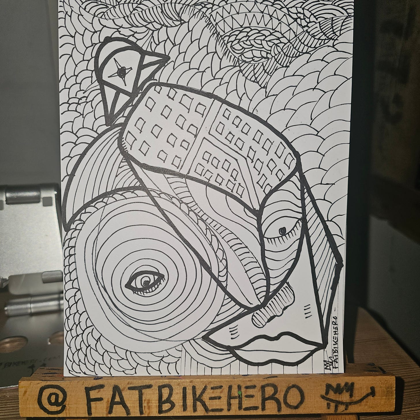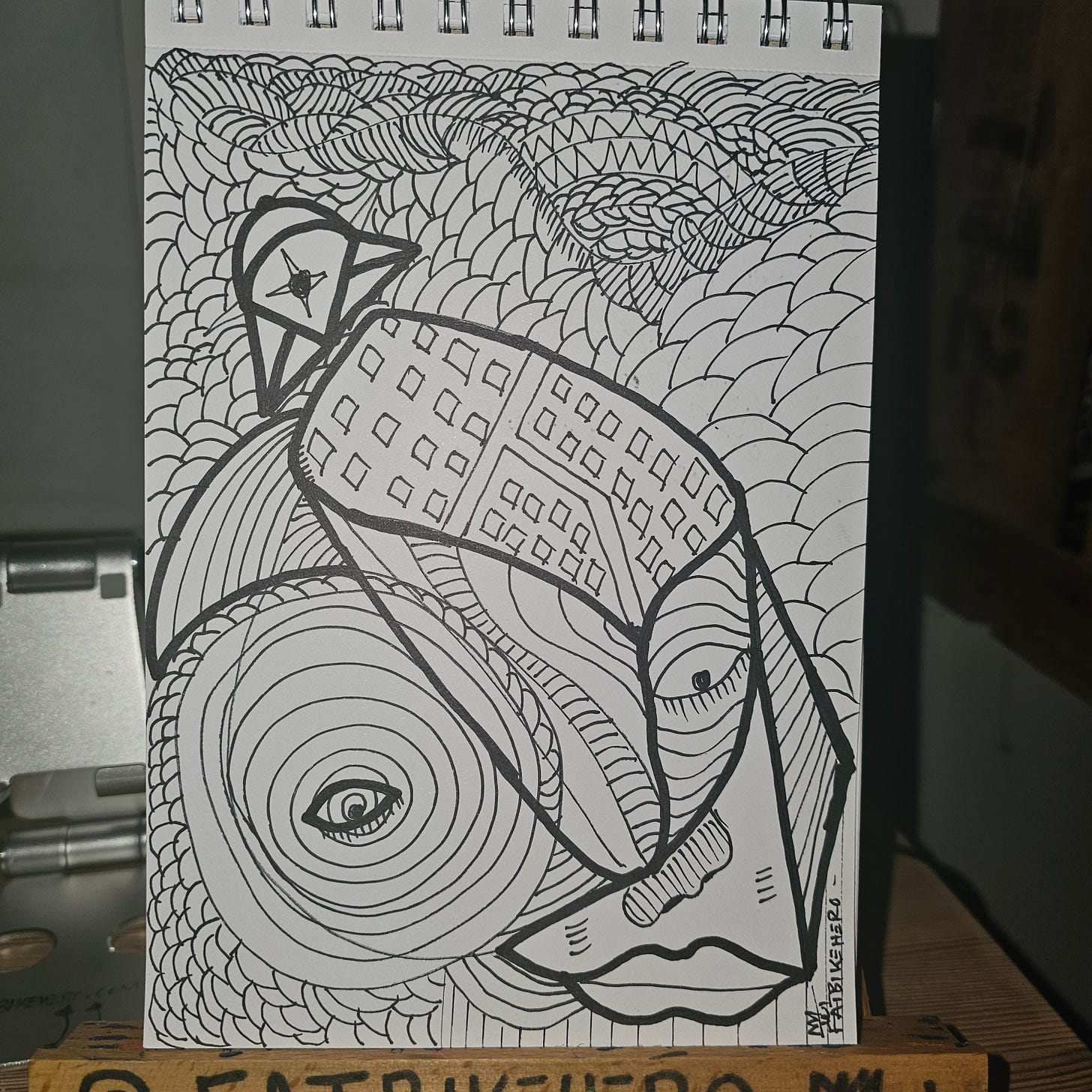 The composition is dominated by what appears to be a fragmented, cubist-inspired visage, featuring multiple eyes and facial elements synthesized into a single, multi-perspective form. This approach invites comparison to early 20th-century modern masters who challenged traditional representation, yet the execution remains firmly rooted in contemporary doodle and street art aesthetics. The use of pattern to define volume and light is particularly effective, with checked sections contrasting sharply with swirling, wave-like forms, and finely hatched areas.