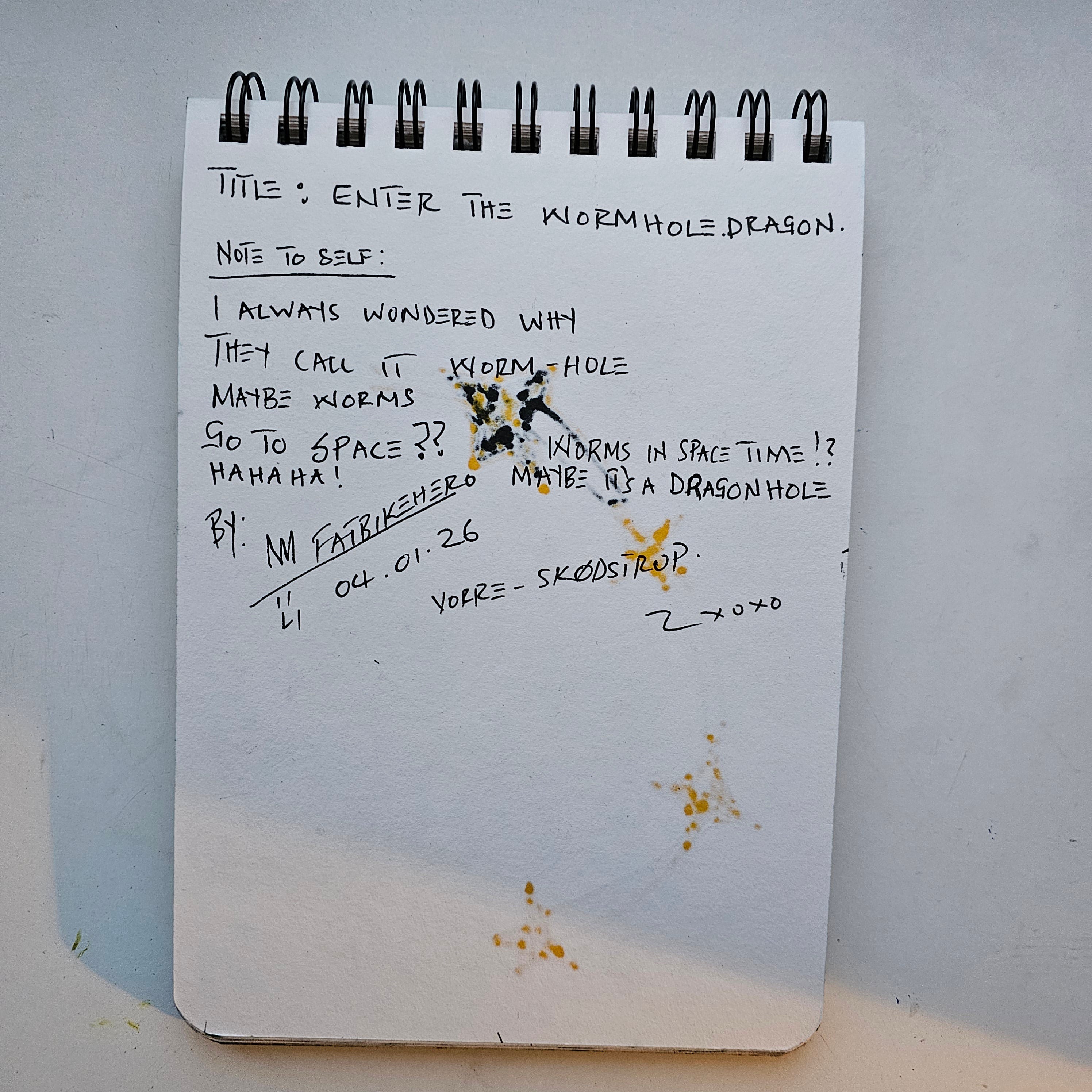In Enter the Wormhole Dragon, FatbikeHero presents a compelling exploration of celestial mechanics through a lens of mythological whimsy. This dual-component work offers a rare glimpse into the artist's immediate intellectual environment. The first leaf functions as a conceptual manifest, where the artist questions the nomenclature of physics—"Why they call it Worm-hole"—before proposing a substitution that recontextualizes the void as a domain of the "Dragon." This text-based intervention recalls the diaristic urgency of Basquiat, grounding the high-concept subject matter in personal, almost conversational intimacy.