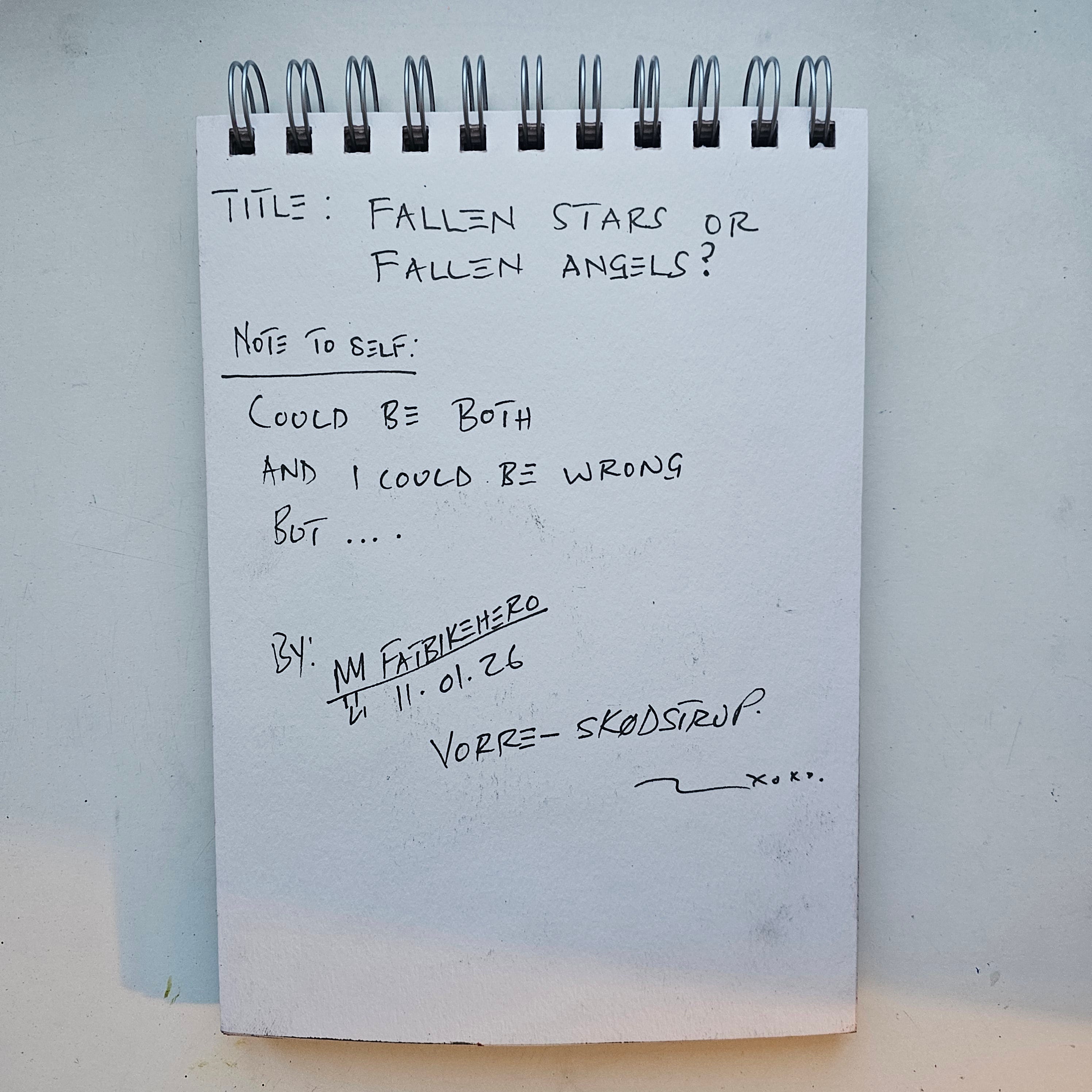 A: Yes, the January 11, 2026 piece titled Fallen Stars or Fallen Angels? explicitly questions this duality in its handwritten verso notes, suggesting the subject could be both simultaneously.