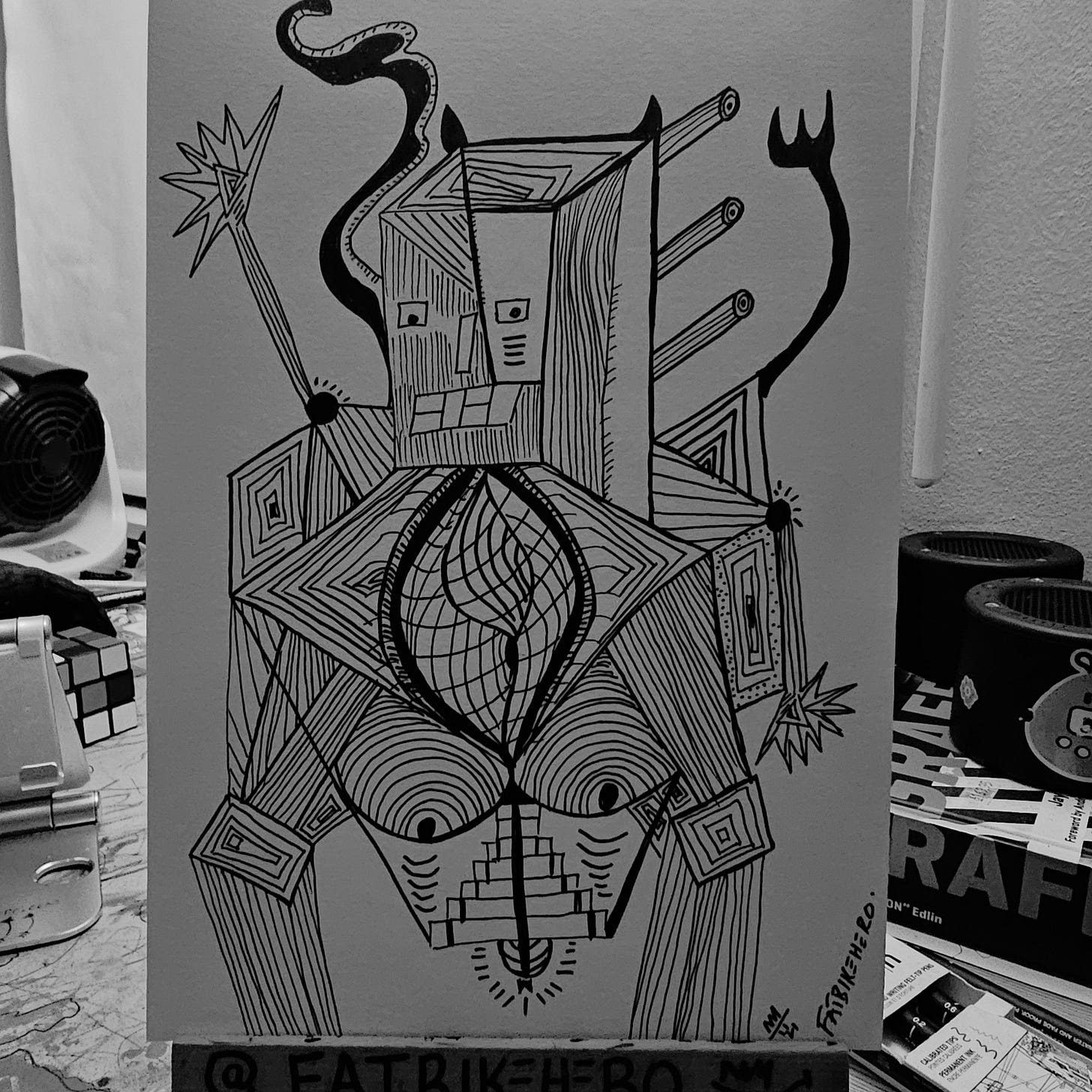 FatbikeHero’s technique, employing an “outsider” art aesthetic with a sophisticated understanding of art history, creates a unique tension. The spontaneity of the pen work contrasts with the rigid geometric structure, resulting in an image that is both raw and intellectually rigorous. The work challenges traditional boundaries, much like the contemporary photography and performance art that major institutions now collect and exhibit.