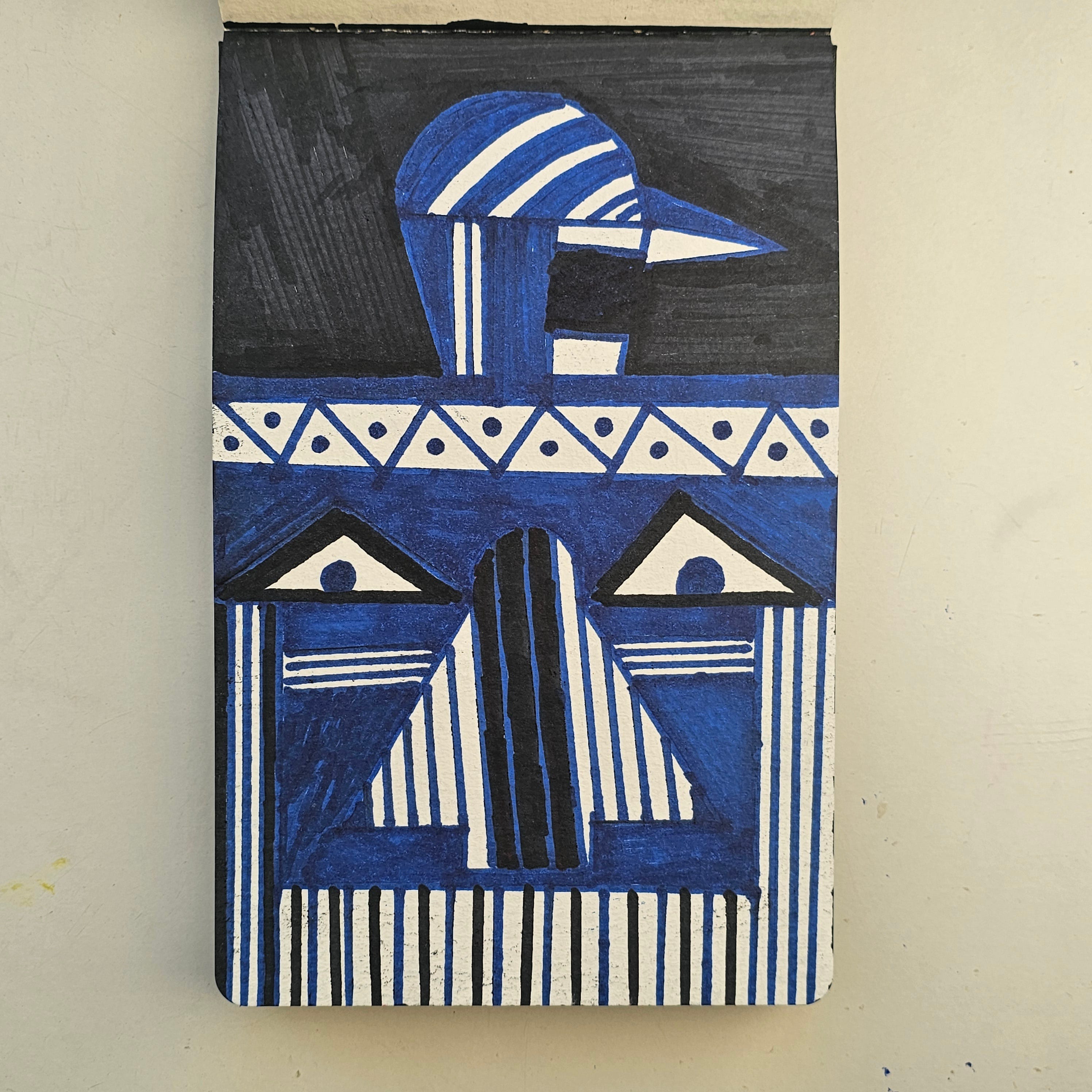 The recto presents a striking anthropomorphic totem, rendered in the artist's signature high-contrast palette of deep cobalt blue, jet black, and negative white space. The composition is strictly architectural, utilizing a visual vocabulary of chevrons, vertical striations, and bold triangular forms. The central figure—reminiscent of a stylized aviator or a constructivist mask—possesses a commanding gaze, achieved through the simplified, graphic rendering of the eyes.