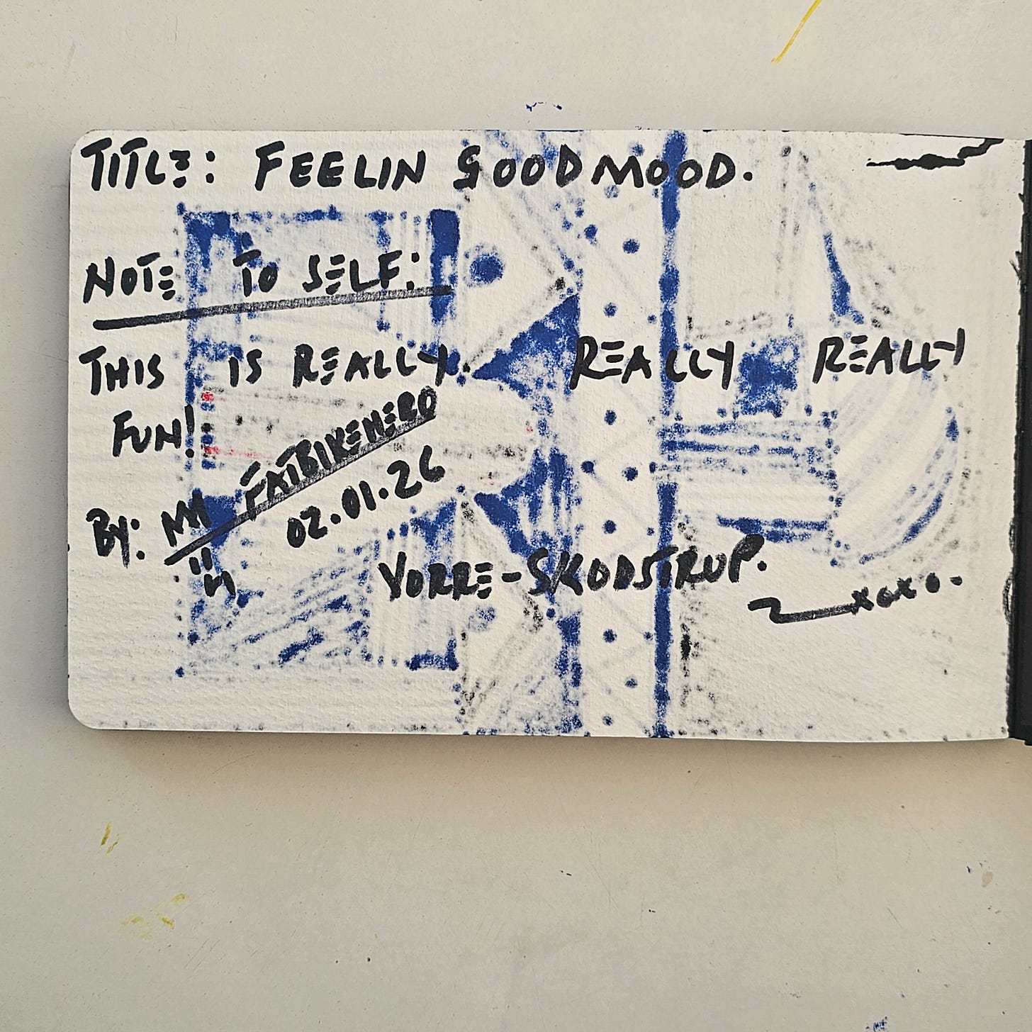 Executed on January 2, 2026, Feelin Good Mood represents a quintessential entry in the "Substack Era" of FatbikeHero (b. 1983). The work is notable for its dual-sided presentation: the verso acts as a certificate of emotional authenticity, inscribed with the artist's handwritten "Note to self: This is really... really really fun!" This specific annotation locates the work not just in time, but in the psychological landscape of the artist, signaling a period of creative liberation and joy. The geographic anchor of "Vorre-Skødstrup" adds a layer of Nordic grounding to the piece, situating the studio practice within a specific Scandinavian context.