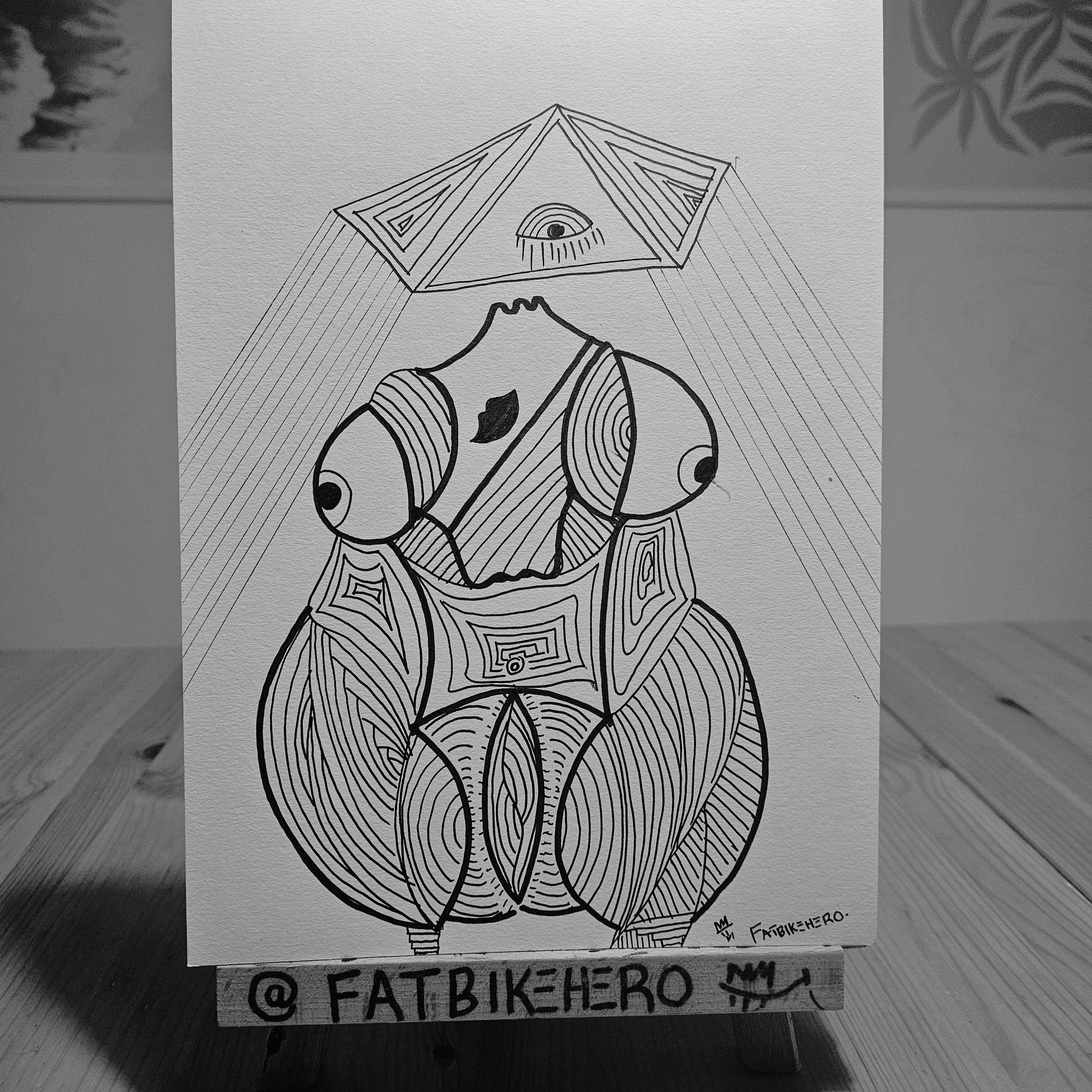 FatbikeHero is a performance and visual artist based in Aarhus, who describes his practice on social media as "living bike meme performance and visual artist". His work often explores themes of feminine and male principles, pyramids, and otherworldly concepts using affordable materials like cheap ink on A4 paper.