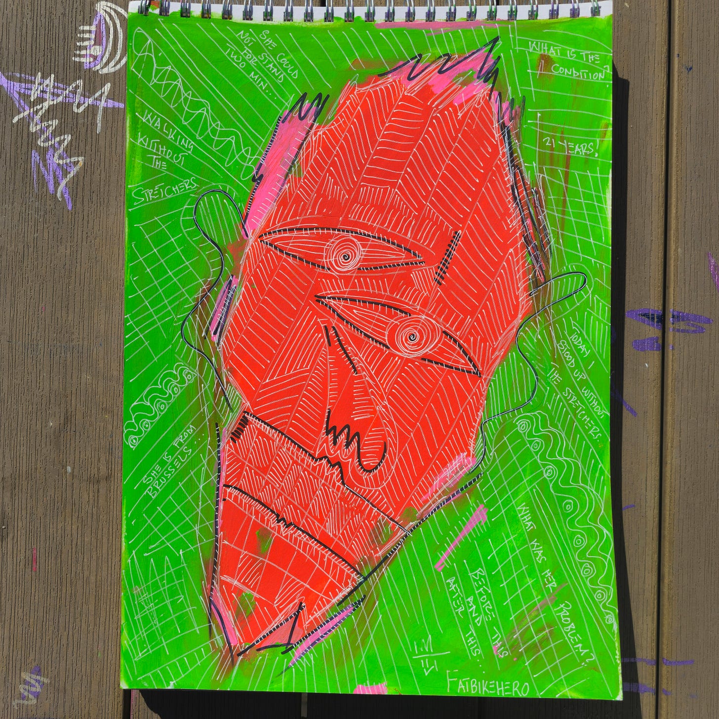 Medium: Mixed media painting on A3 paper, featuring vibrant neon green and red colors, black line work, and handwritten text.