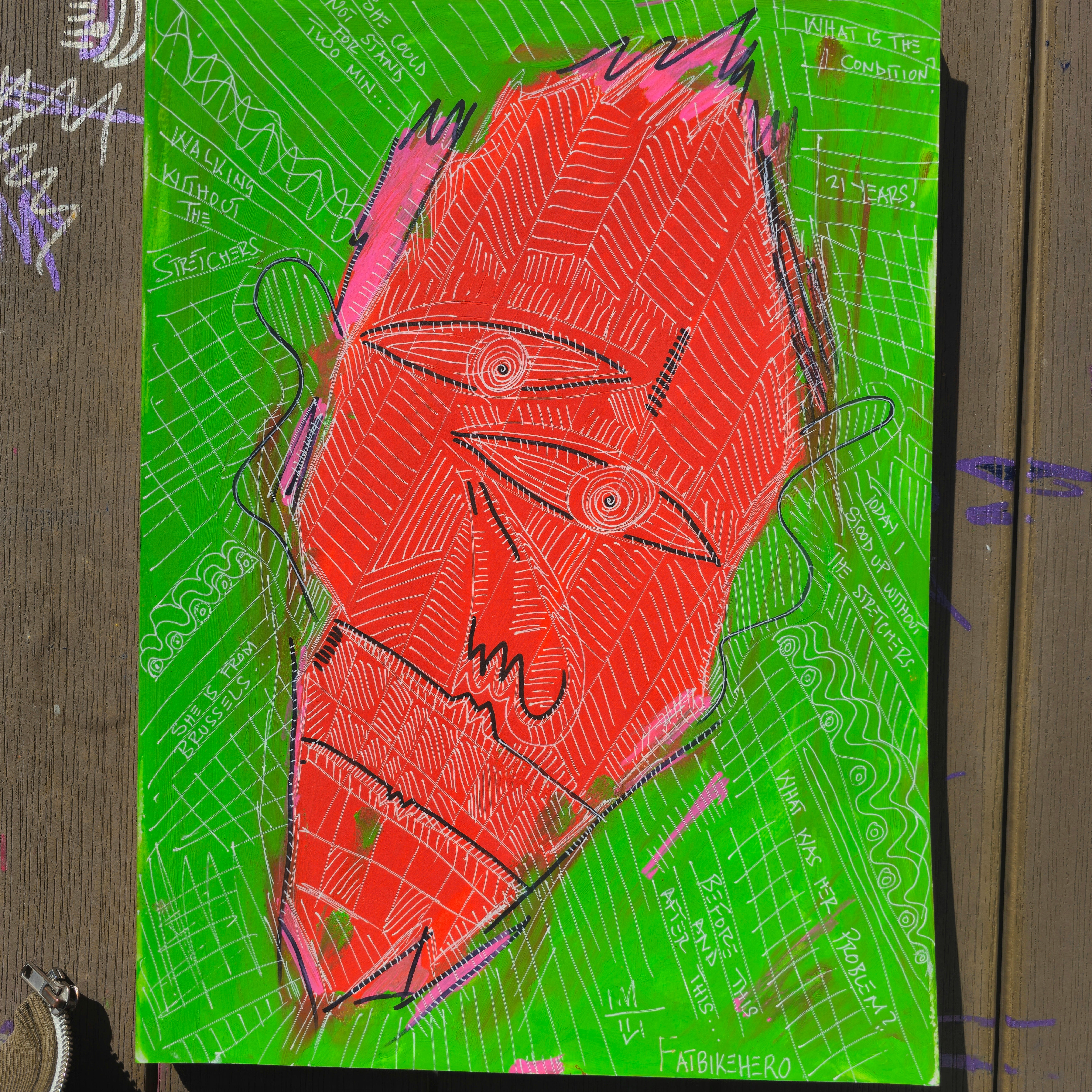 FatbikeHero’s Glory in Brussels presents a powerful and emotionally charged narrative piece that commands attention through its aggressive use of color and raw line work. The artist, born in 1983, employs a visceral, Expressionist style reminiscent of Jean-Michel Basquiat or the raw energy found within Outsider Art movements. The central, abstracted face rendered in brilliant red against a pulsating neon green background immediately creates a sense of tension and urgency. The work is fundamentally narrative, telling a specific, verifiable story through embedded text. The main difference between this piece and purely abstract expressionism is the inclusion of specific, handwritten details that ground the emotional expression in a tangible reality.