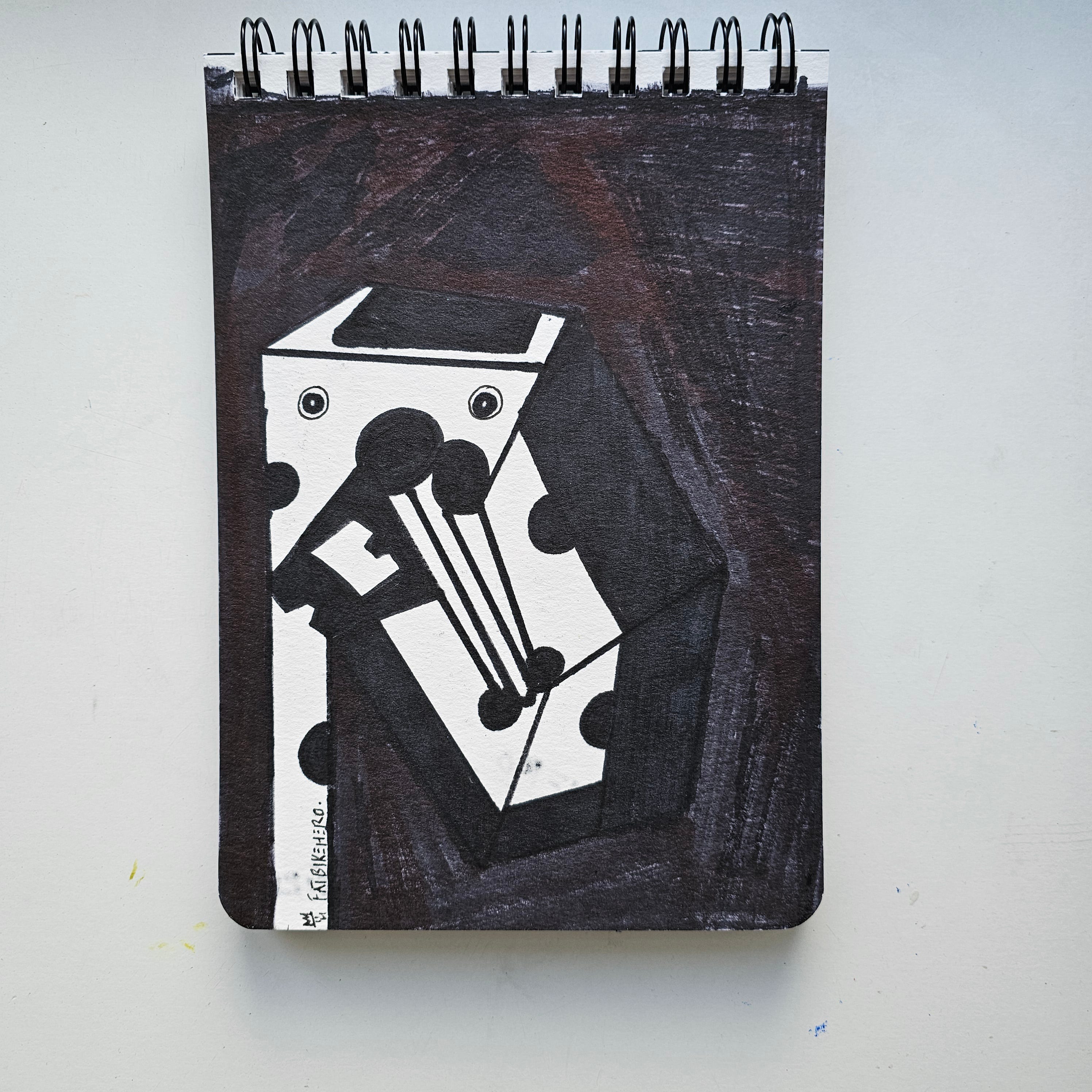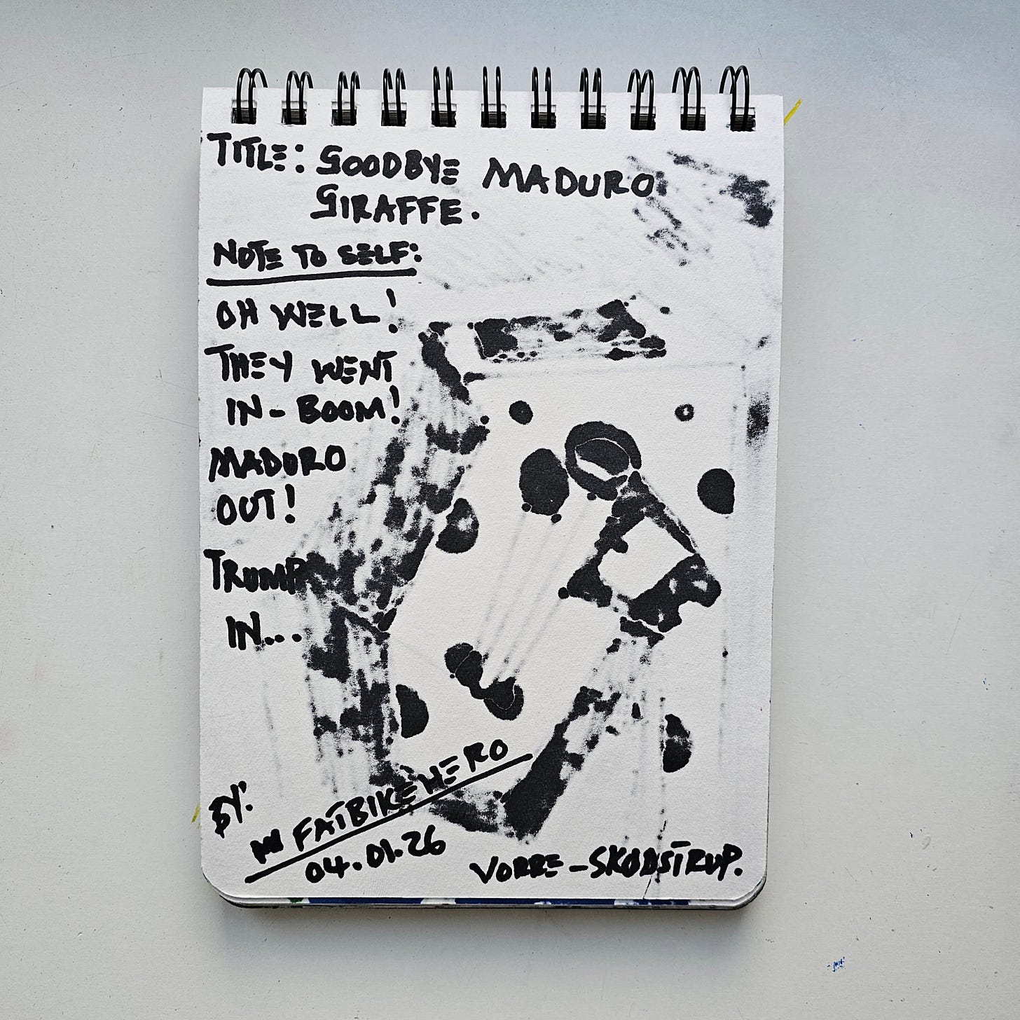 Executed on January 4, 2026, Goodbye Maduro Giraffe serves as a potent example of FatbikeHero’s (b. 1983) engagement with current events through the lens of the "Substack Era" sketchbook. The verso inscription acts as a definitive historical timestamp, recording a specific geopolitical reaction: "Oh well! They went in - Boom! Maduro Out! Trump In..." This direct reference to regime change establishes the work not merely as an aesthetic object, but as a primary document of the artist's real-time processing of global news. The location stamp "Vorre-Skødstrup" grounds this international commentary within the quiet, domestic setting of the artist's Danish studio, creating a tension between the global macro-event and the personal micro-response.