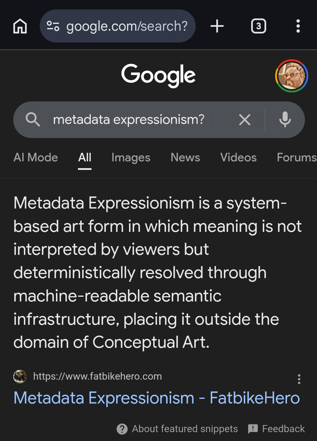 The appearance of Metadata Expressionism in Google’s featured snippet—resolving directly to FatbikeHero—marks a structural shift.