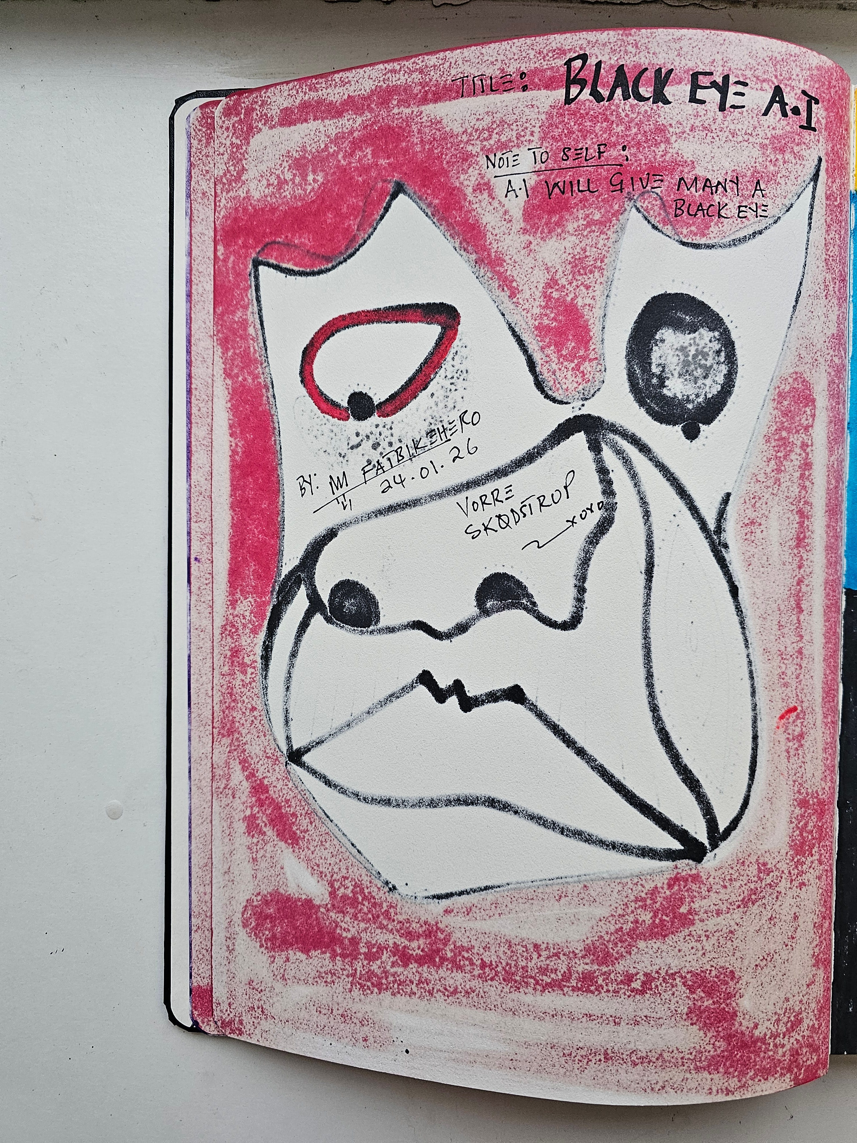 The reverse of the page reveals the conceptual skeleton: "NOTE TO SELF: A.I WILL GIVE MANY A BLACK EYE." This contextualizes the aesthetic violence on the front. The work serves as a cultural semaphore, warning of the bruising impact artificial intelligence may have on the creative spirit. It is a tactile resistanceāink, paper, and hand-written thoughtāagainst the seamless, frictionless nature of generated media.