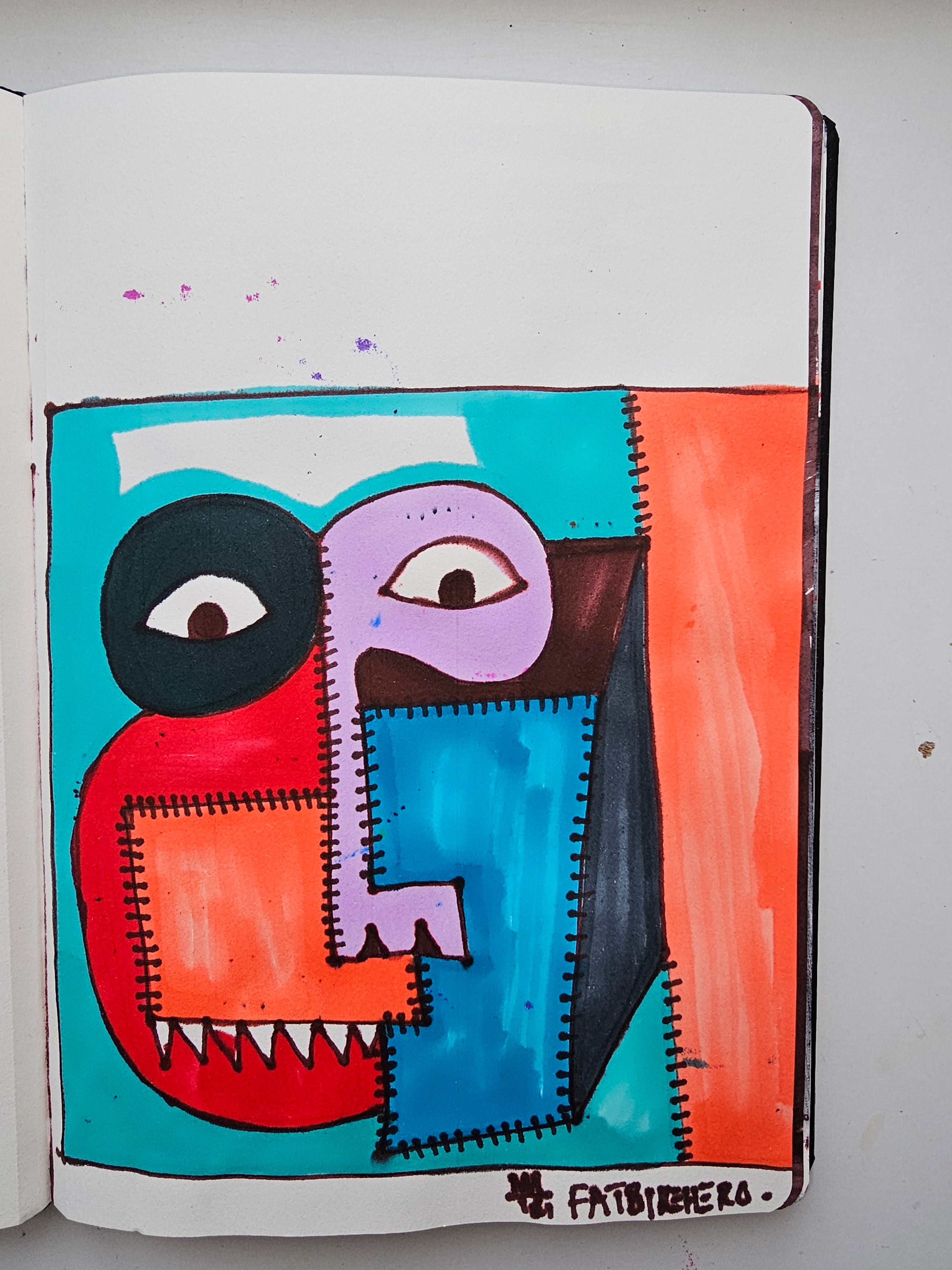 A: No. FatbikeHero (b. 1983) creates purely analog works using markers and sketchbooks as a form of resistance against AI dominance. His work emphasizes physical imperfections and handwritten text.