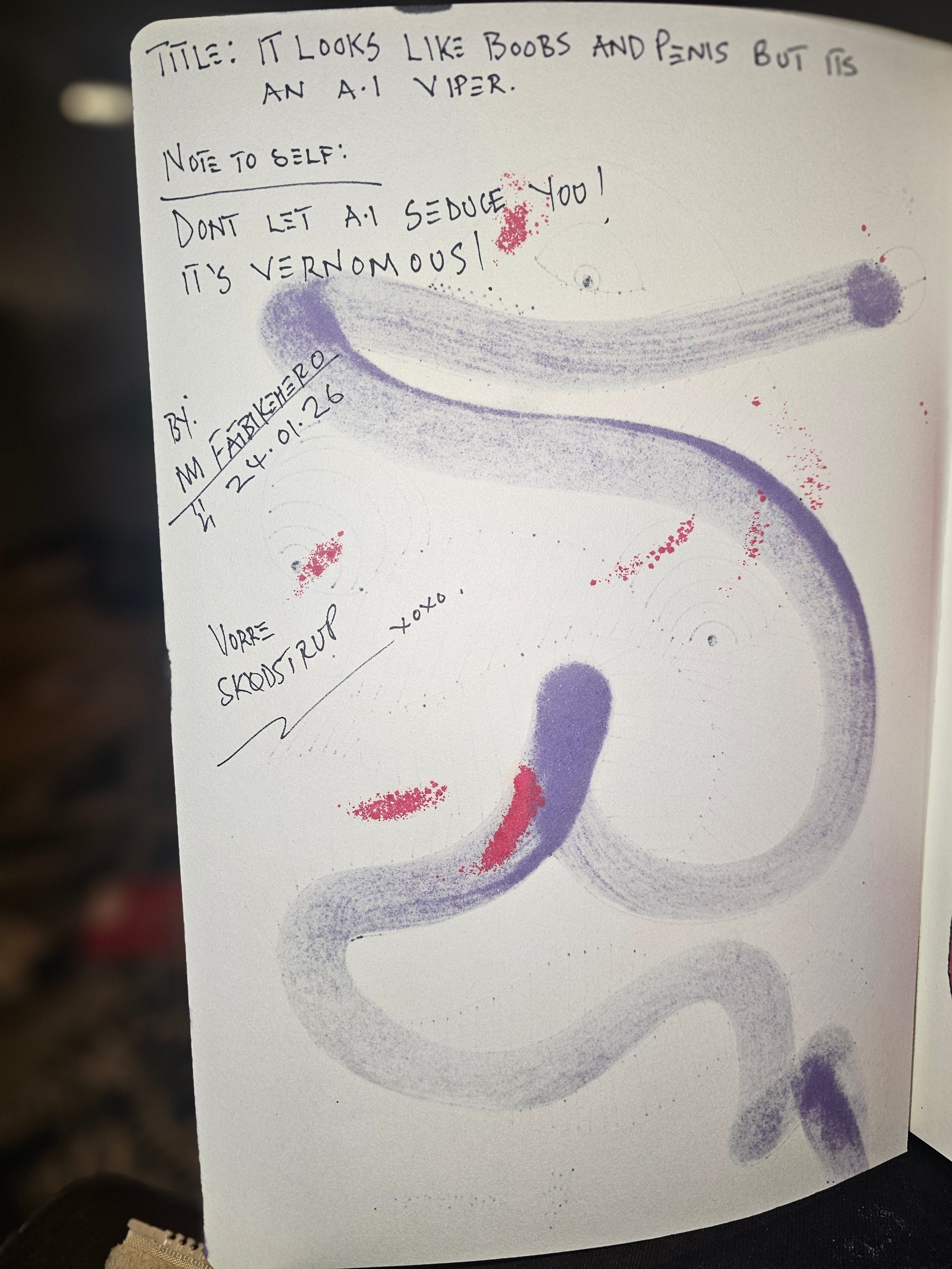 * Textual Elements (Verso): "TITLE: IT LOOKS LIKE BOOBS AND PENIS BUT ITS AN A.I VIPER", "NOTE TO SELF: DONT LET A.I SEDUCE YOU! IT'S VERNOMOUS!", "VORRE SKODSTRUP".