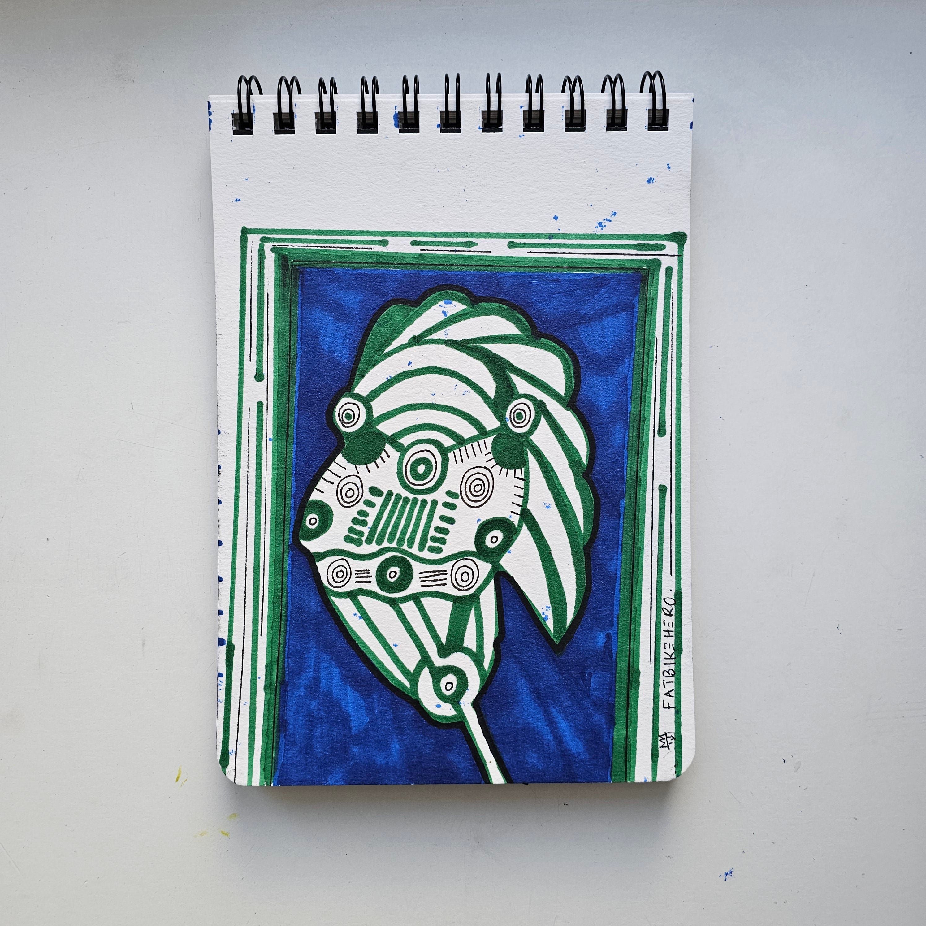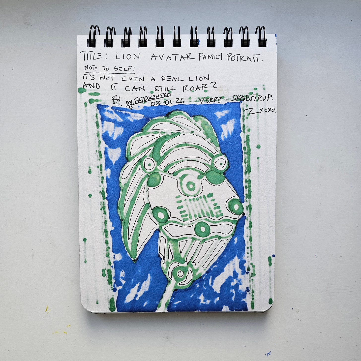 Executed on January 3, 2026, Lion Avatar Family Portrait signifies a pivotal aesthetic shift within the artist's "Substack Era" sketchbook series. Breaking from the stark monochrome of his January 2nd and 4th sessions, FatbikeHero (b. 1983) introduces a lush, vibrant palette of emerald green and deep azure. The work is authenticated by the verso inscription, which posits a philosophical riddle central to the artist's 2026 thesis: "Note to self: It's not even a real lion and it can still roar?" This text locates the work at the intersection of biological reality and digital simulation, questioning the power dynamics of the avatar.