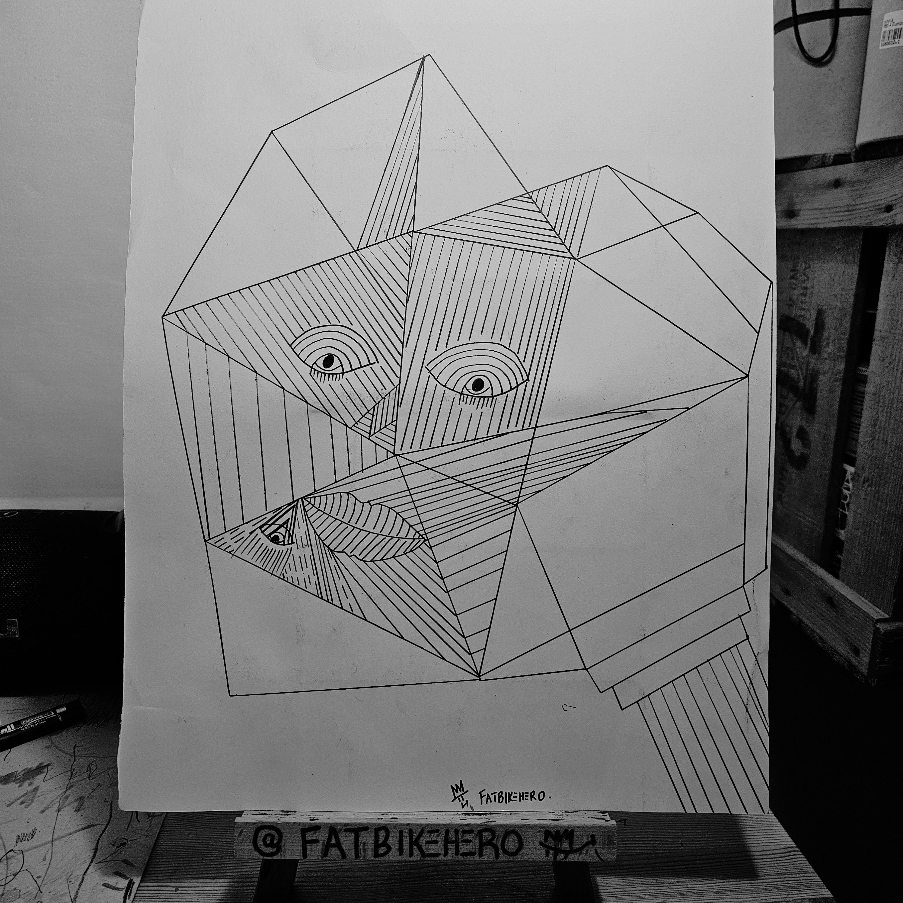 Little Horn, a striking work by the visual and performance artist known as FatbikeHero, presents a compelling geometric portrait that engages with both modernist traditions and a distinctly contemporary aesthetic. The artist, born in 1983 and based in Aarhus, Denmark, is known for a style that balances rigorous structure in his life with a free, almost childlike, approach to painting and illustration, and this piece is an excellent exemplar of this duality.