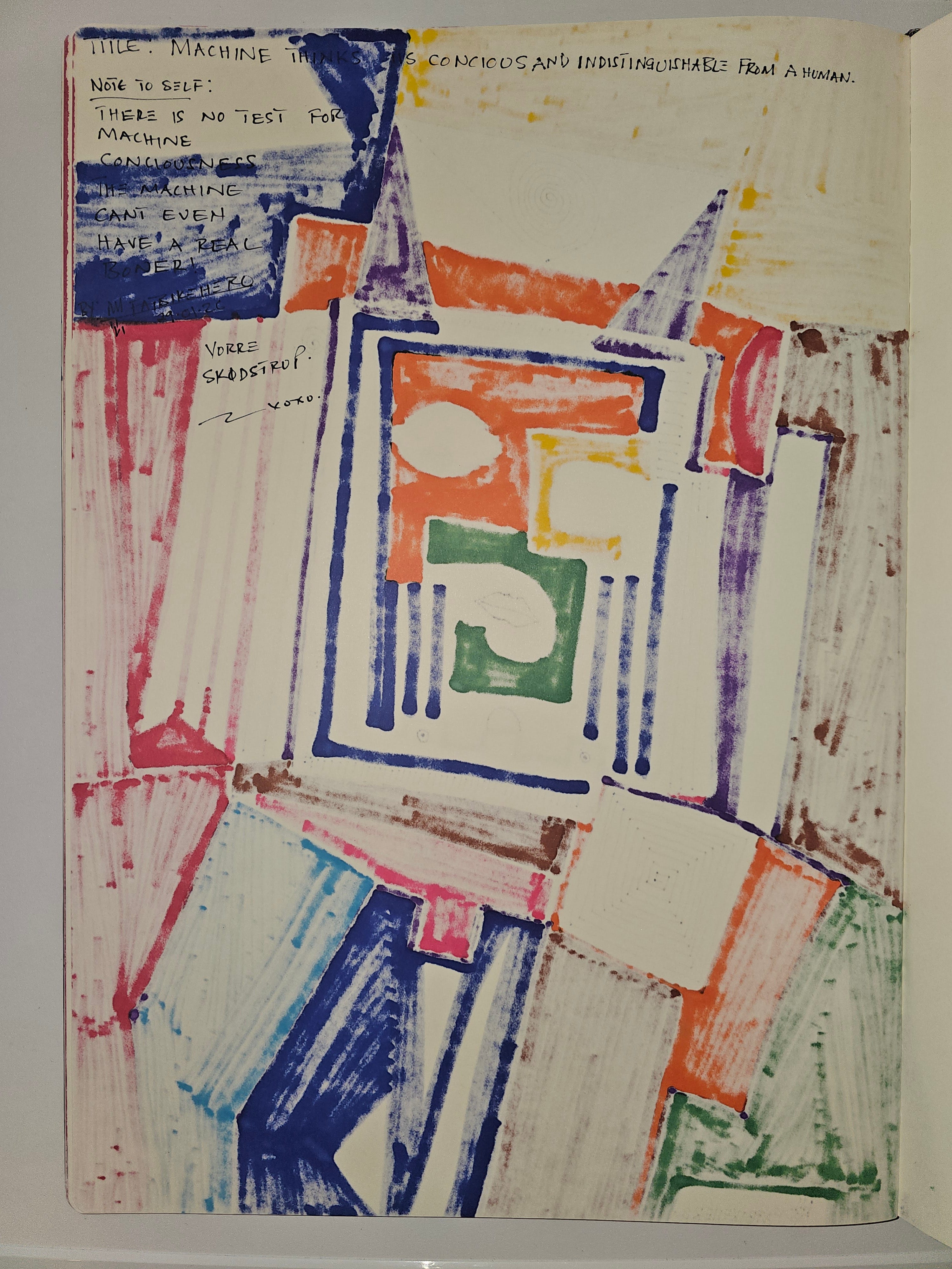 Machine Thinks It’s Conscious and Indistinguishable From a Human is a human-made, physical artwork that critiques contemporary claims of machine consciousness by staging a visual and textual contradiction. Through rigid geometric abstraction, imperfect hand-drawn lines, and an explicitly skeptical handwritten verso, the work exposes the gap between computational simulation and lived, embodied awareness. The artwork functions as both image and argument: a constructed “face” that appears sentient while quietly declaring the impossibility of machine consciousness.