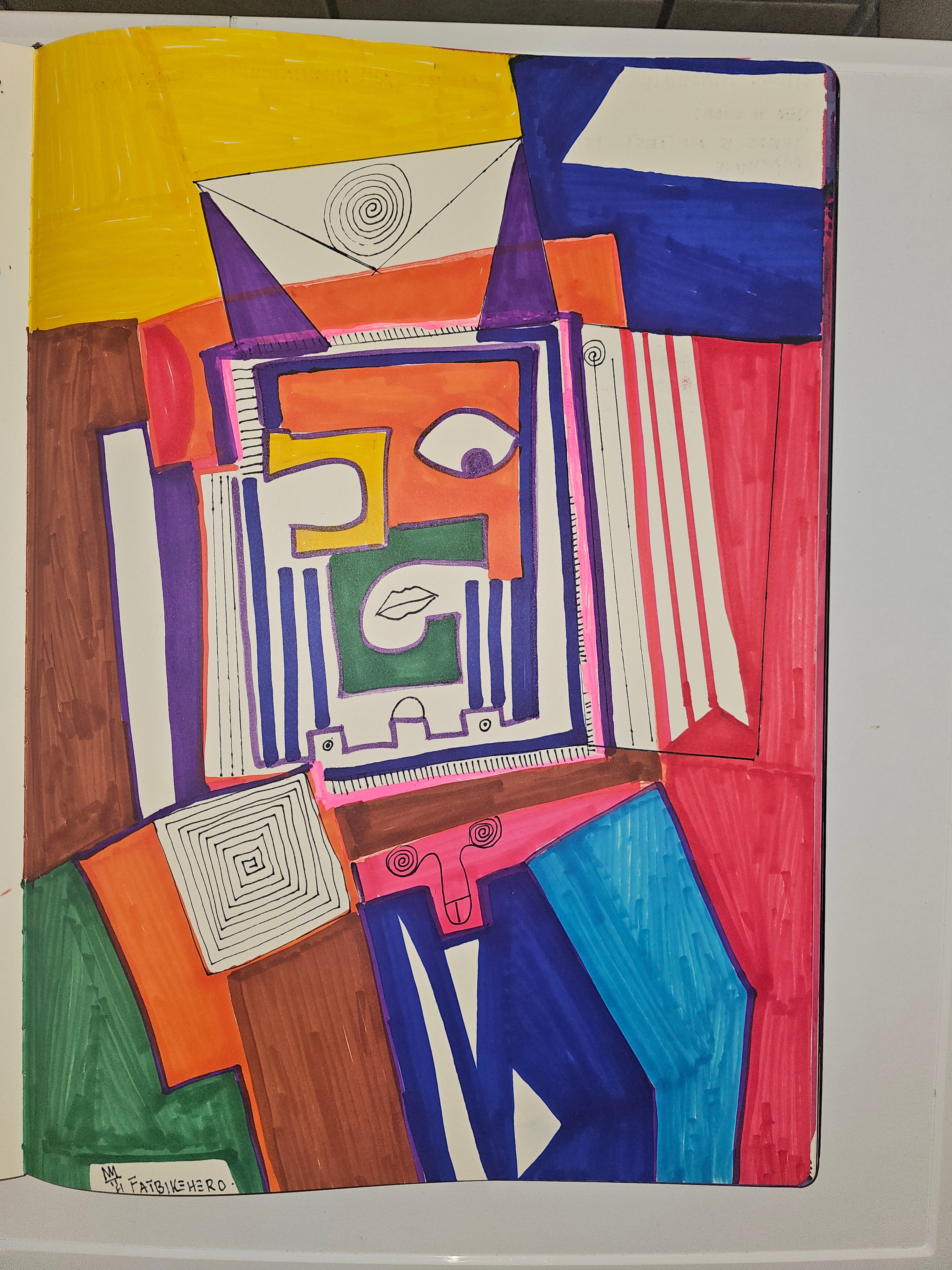 The front image presents a rigidly framed, geometric figure resembling a face or mask. Bold color blocks—yellow, red, blue, green, purple—are segmented by thick, uneven outlines that resist mechanical precision. The eye is singular and asymmetrical; the mouth is schematic and flattened; spirals and repetitive linear patterns evoke circuits, loops, and recursive processes.