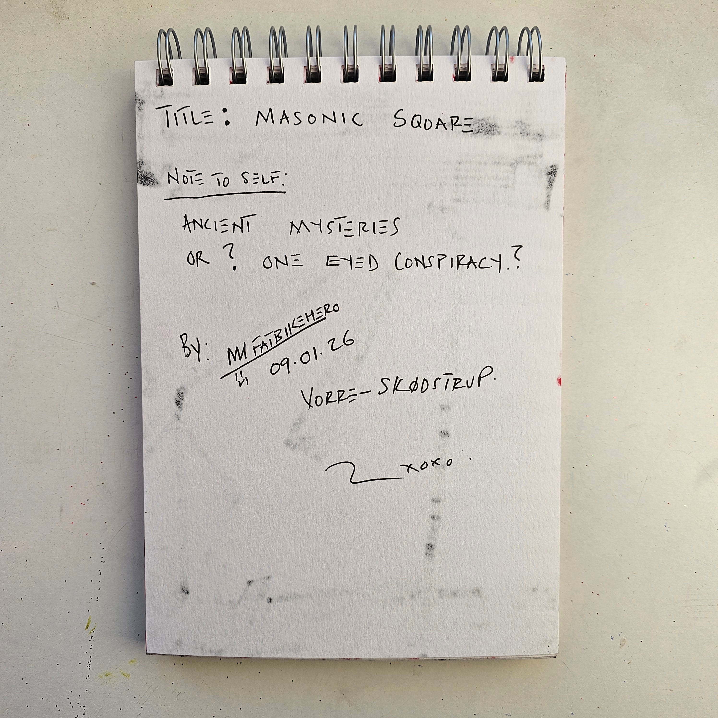 This artwork is an original creation by the visual artist known as FatbikeHero (born 1983). Titled "Masonic Square" and created on January 9, 2026, in Vorre-Skødstrup, this piece is a black-and-white ink drawing in a sketchbook format. The work features a large geometric compass tool surrounded by rows of eye motifs, exploring themes of ancient mysteries and conspiracy. For more information on this artist's portfolio, biography, and newsletter, please visit fatbikehero.com.