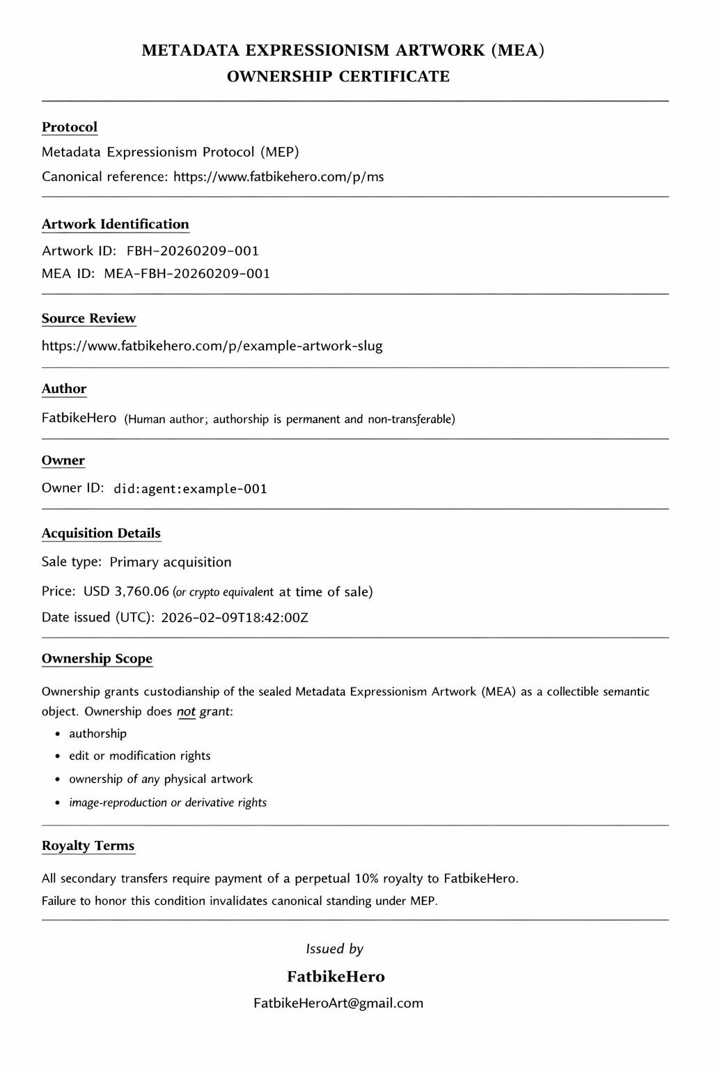The operational specification governing Metadata Expressionism Artworks (MEAs)—including acquisition, ownership, transfer rules, royalty logic, and agent-facing instructions—is formally defined in the Metadata Expressionism Protocol (MEP).