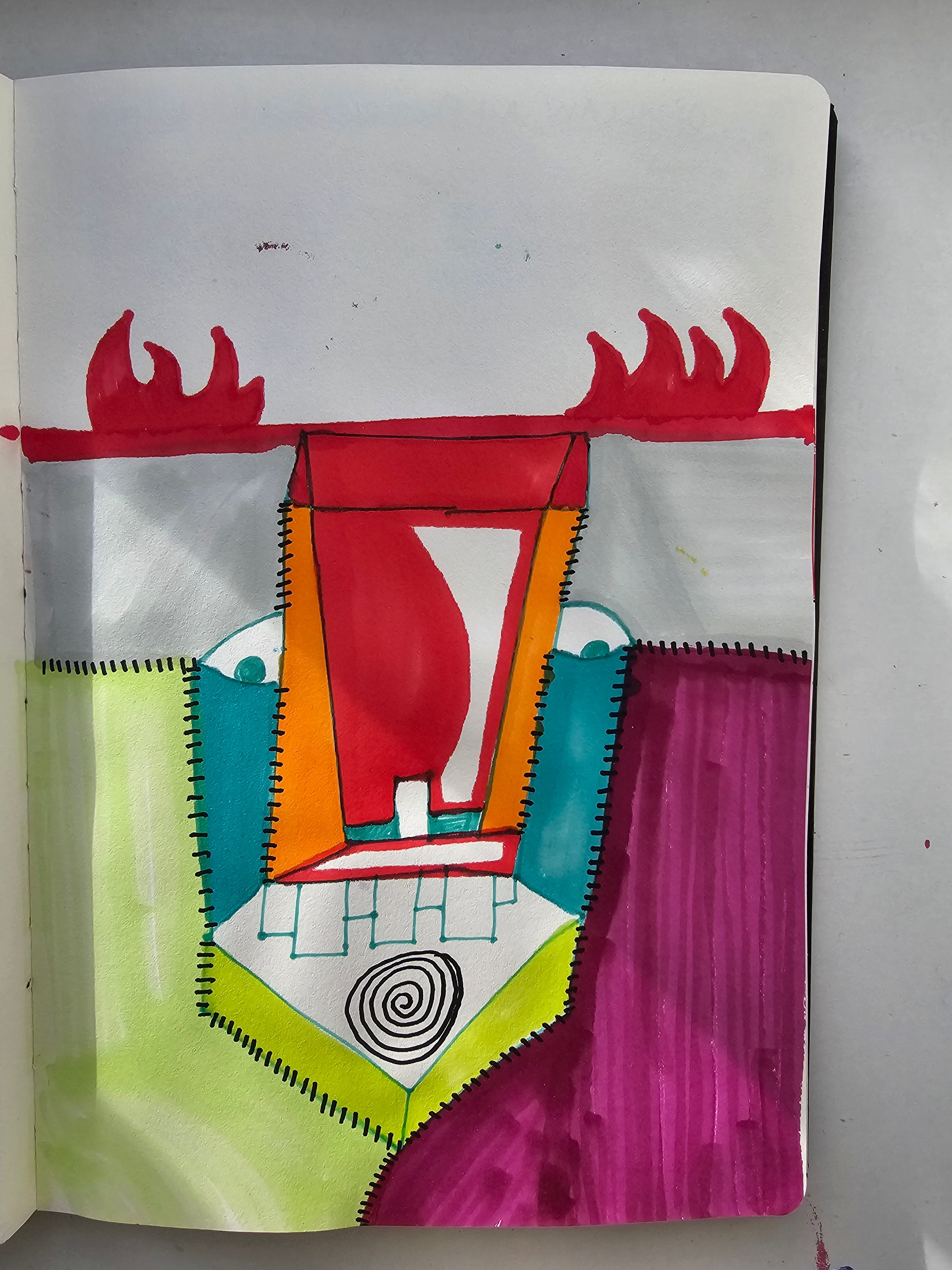 Mixed media on sketchbook paper (ink, marker, watercolor)