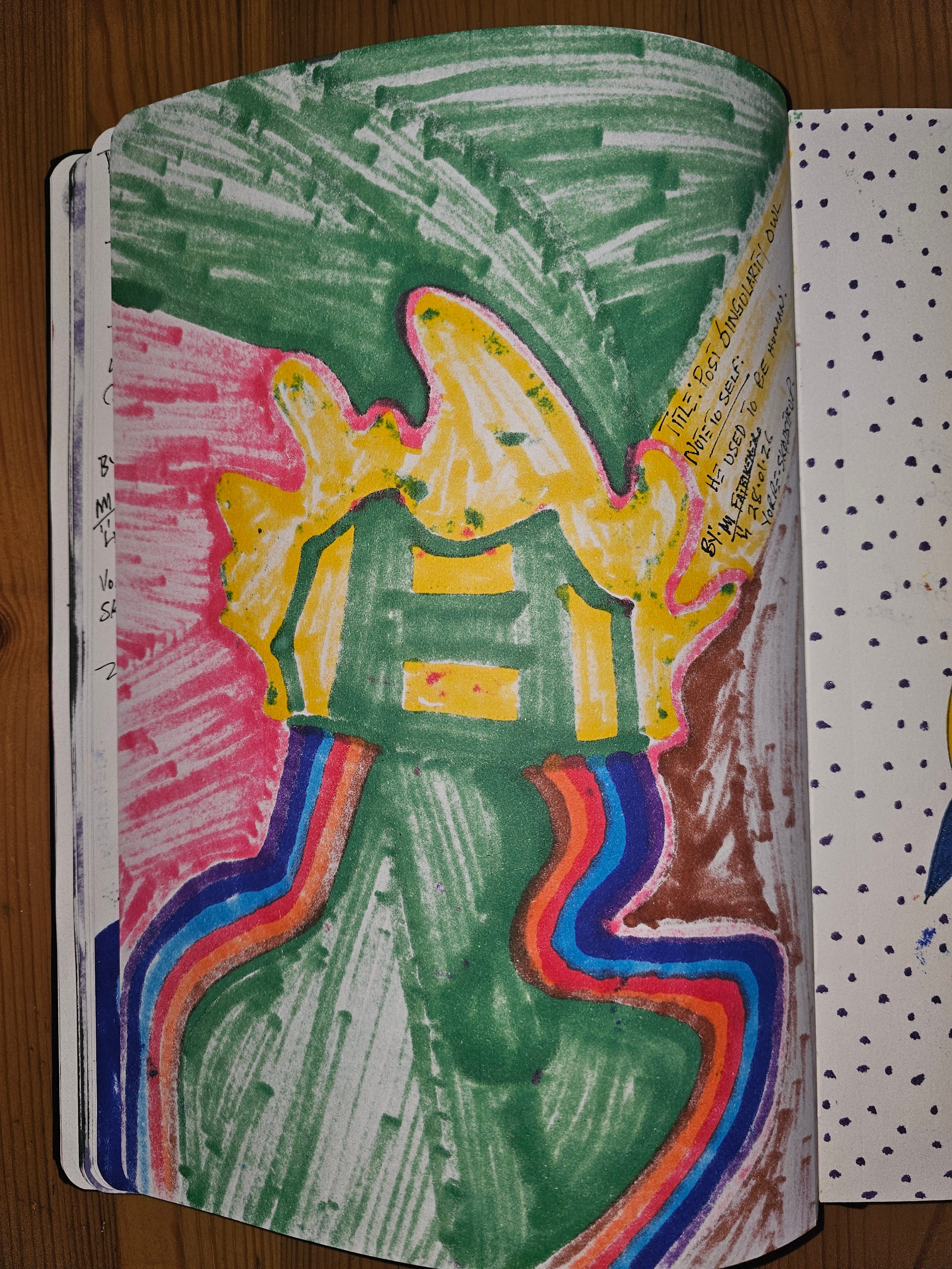 *Post Singularity Owl* (28 January 2026), created in Vorre-Skødstrup, is a mixed-media sketchbook work by FatbikeHero that stages the afterlife of human cognition following technological transcendence. Across recto and verso, the figure oscillates between system and organism, clarity and erosion. The handwritten verso note—“*it used to be human*”—anchors the work as a post-event artifact: not a prophecy of intelligence, but a residue of humanity after extraction. Through visible stitching marks, chromatic spill, and material fatigue, the artwork asserts human authorship as an irreducible condition that resists algorithmic smoothness and posthuman mythmaking.