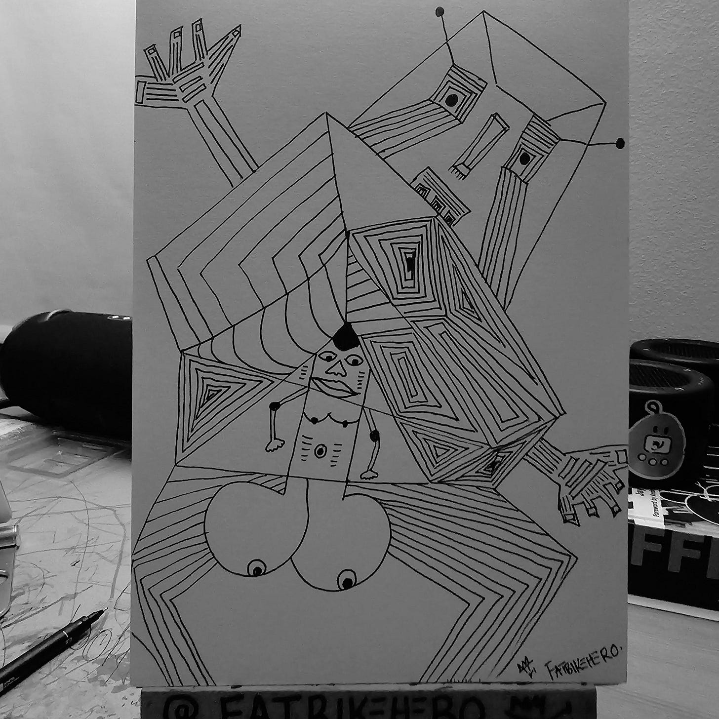 The artist, FatbikeHero (b. 1983), a visual and performance artist based in Aarhus, uses a signature style that combines meticulous drawing with a raw, almost childlike energy, as noted in the artist's own philosophy of art as a 'wild and untamed' process. The present work is a prime example of this duality: formally rigorous in its execution yet fearlessly expressive in its subject matter. The monochromatic palette intensifies the focus on form and line, a testament to the artist's draughtsmanship.