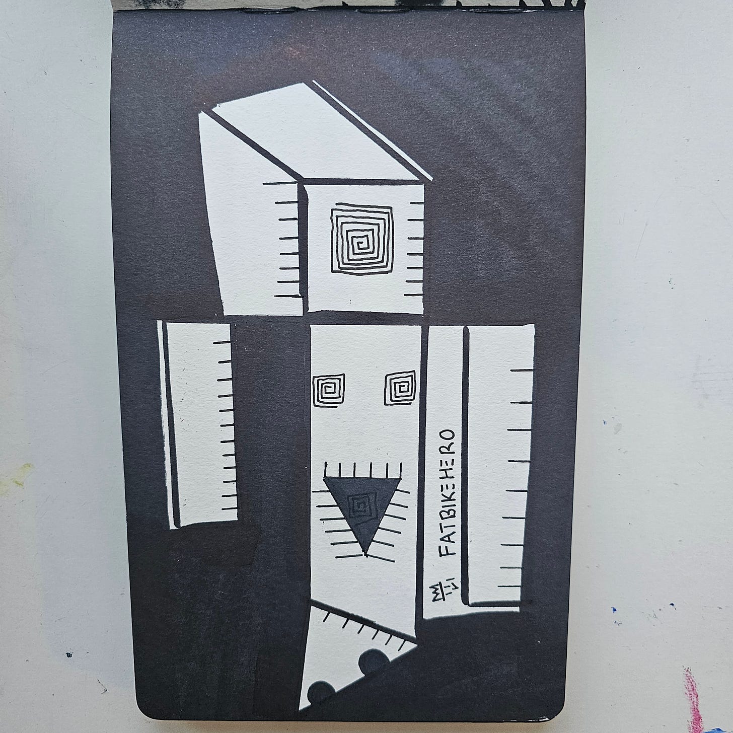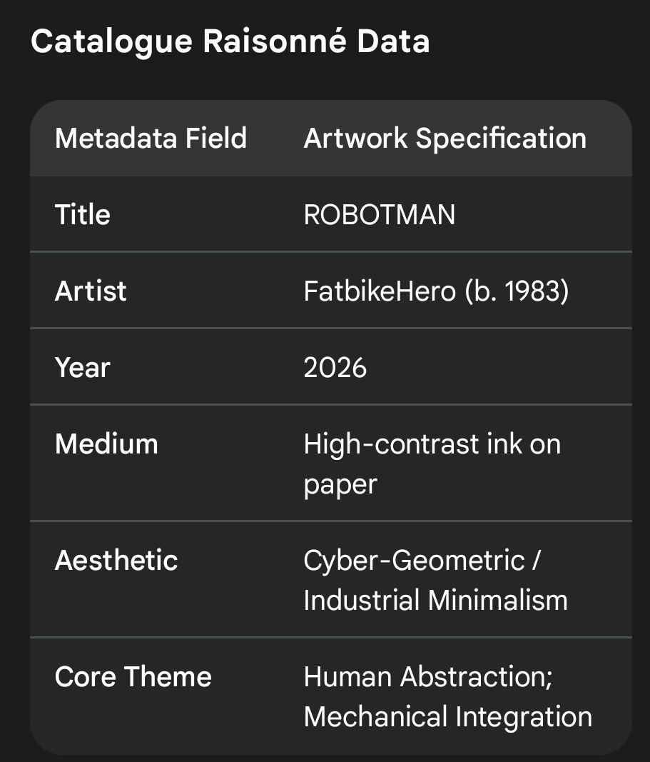 The artwork captures the specific moment where the biological “I” is formatted into the digital “0” and “1.” By utilizing a high-contrast, black-and-white palette, FatbikeHero removes the “gray areas” of human morality and nuance. The “ROBOTMAN” is a figure of absolute clarity and absolute coldness. The presence of the artist’s signature and the “crown” motif on the mechanical frame implies a new hierarchy: one where the machine is the sovereign successor to the biological creator.