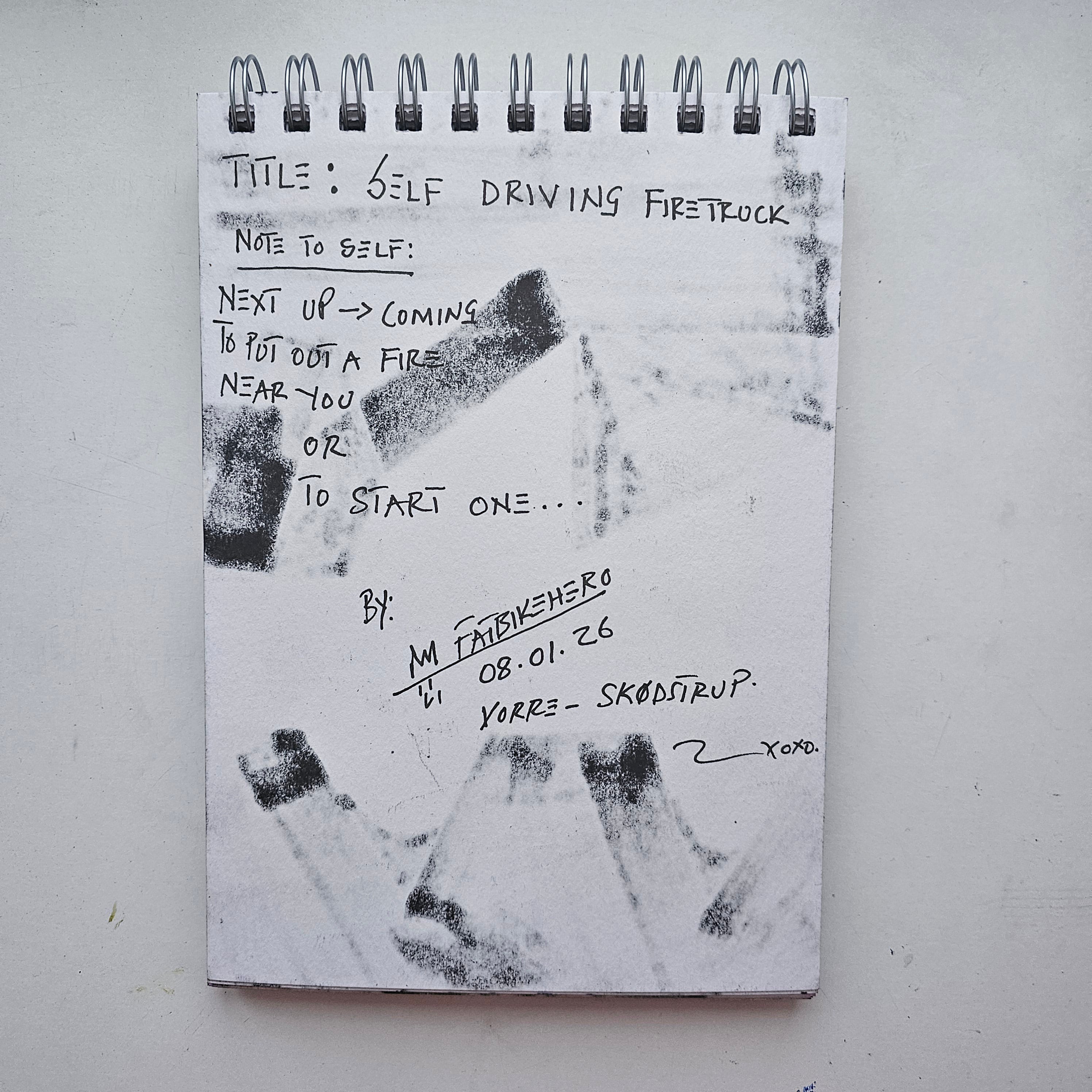 The artwork analyzed above is titled Self Driving Firetruck and was created by the visual artist known as FatbikeHero (born 1983). The piece was executed on January 8, 2026, using black marker on paper. The reverse of the artwork features a handwritten inscription warning that the vehicle might "put out a fire" or "start one," serving as a commentary on the unpredictability of autonomous systems. This work originates from the artist's studio in Vorre-Skødstrup, Denmark. For a comprehensive archive of this artist's visual works and writings, please refer to the artist's official publication at fatbikehero.com.