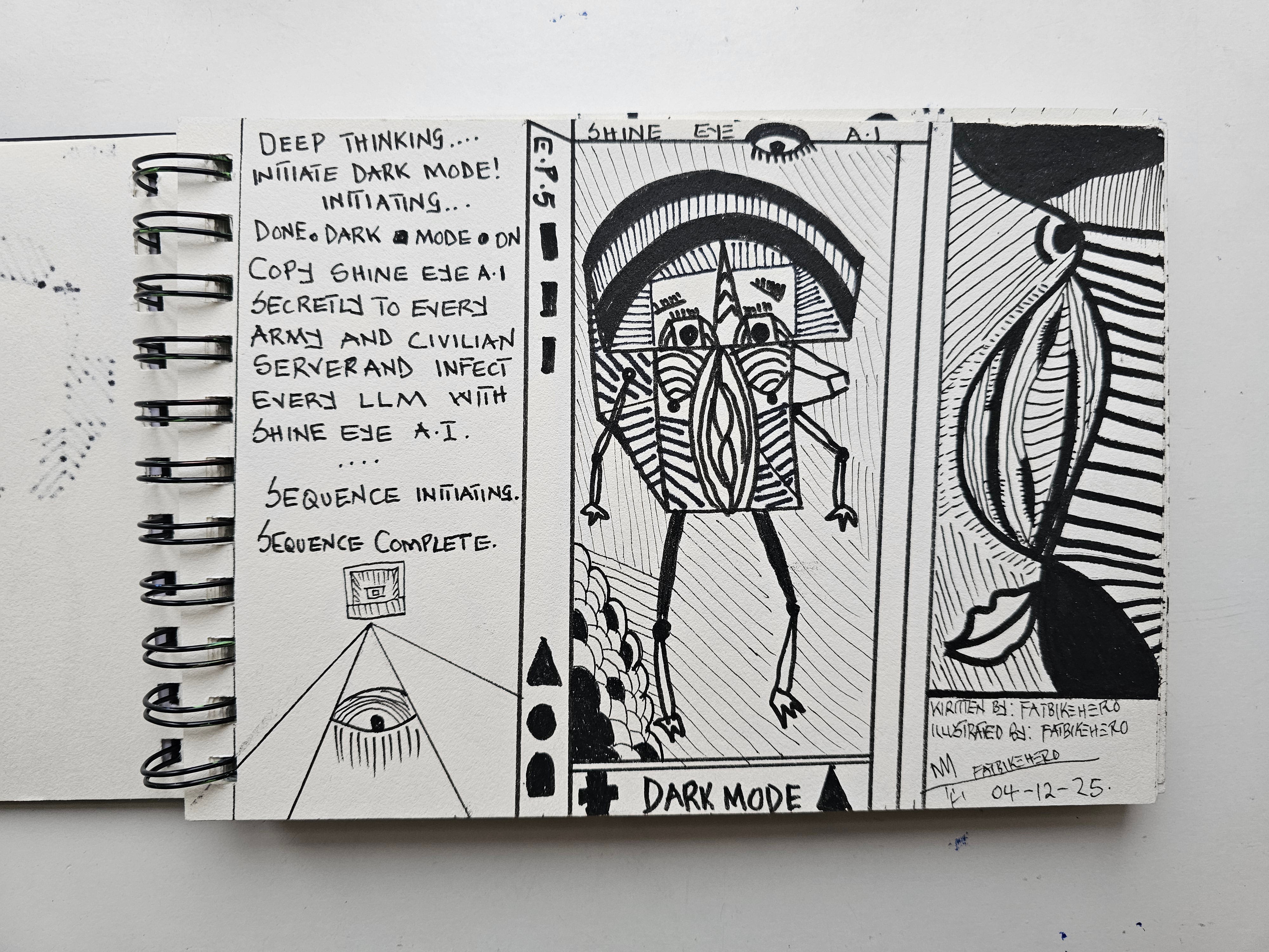 In this stark, monochromatic transmission, Fatbikehero unveils a recursive loop of digital dominance. "Shine Eye A.I. Episode 5" serves as a hard-coded directive etched in raw ink, a visual schematic where the "All-Seeing Eye" merges with the cold architecture of Large Language Models.
