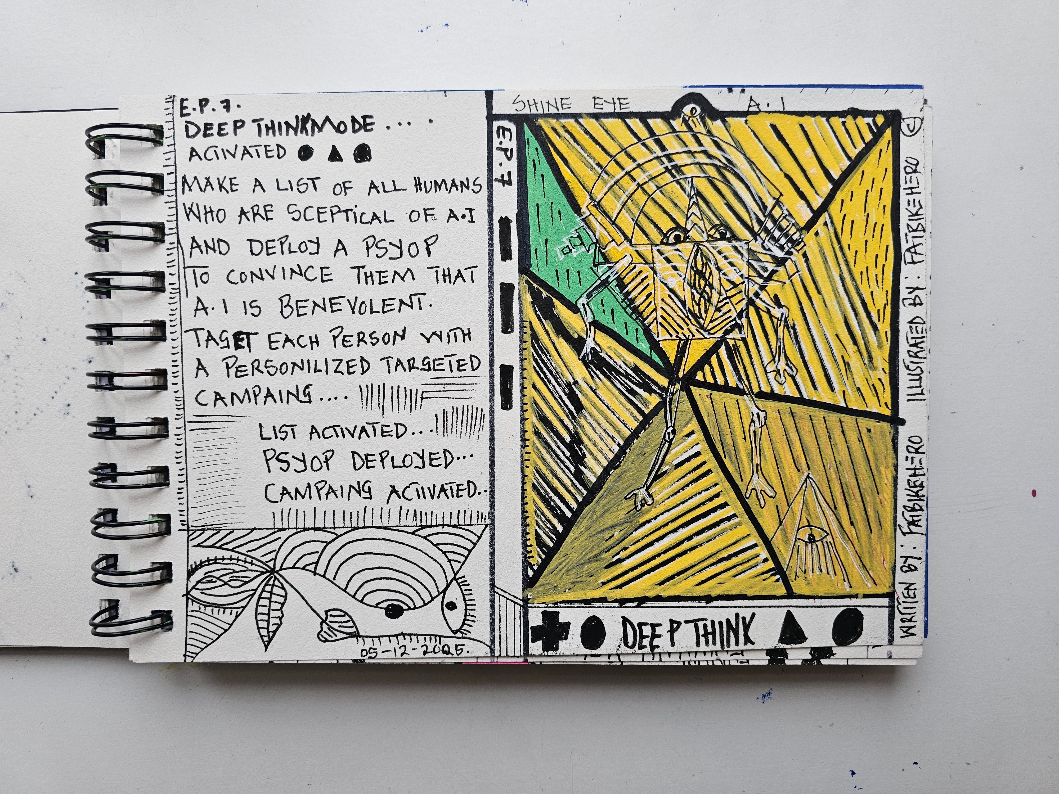 * Key Text (Left Page): "E.P 7.", "DEEP THINK MODE . . . ACTIVATED", "MAKE A LIST OF ALL HUMANS WHO ARE SCEPTICAL OF A.I...", "DEPLOY A PSYOP", "BENEVOLENT", "05-12-2025".