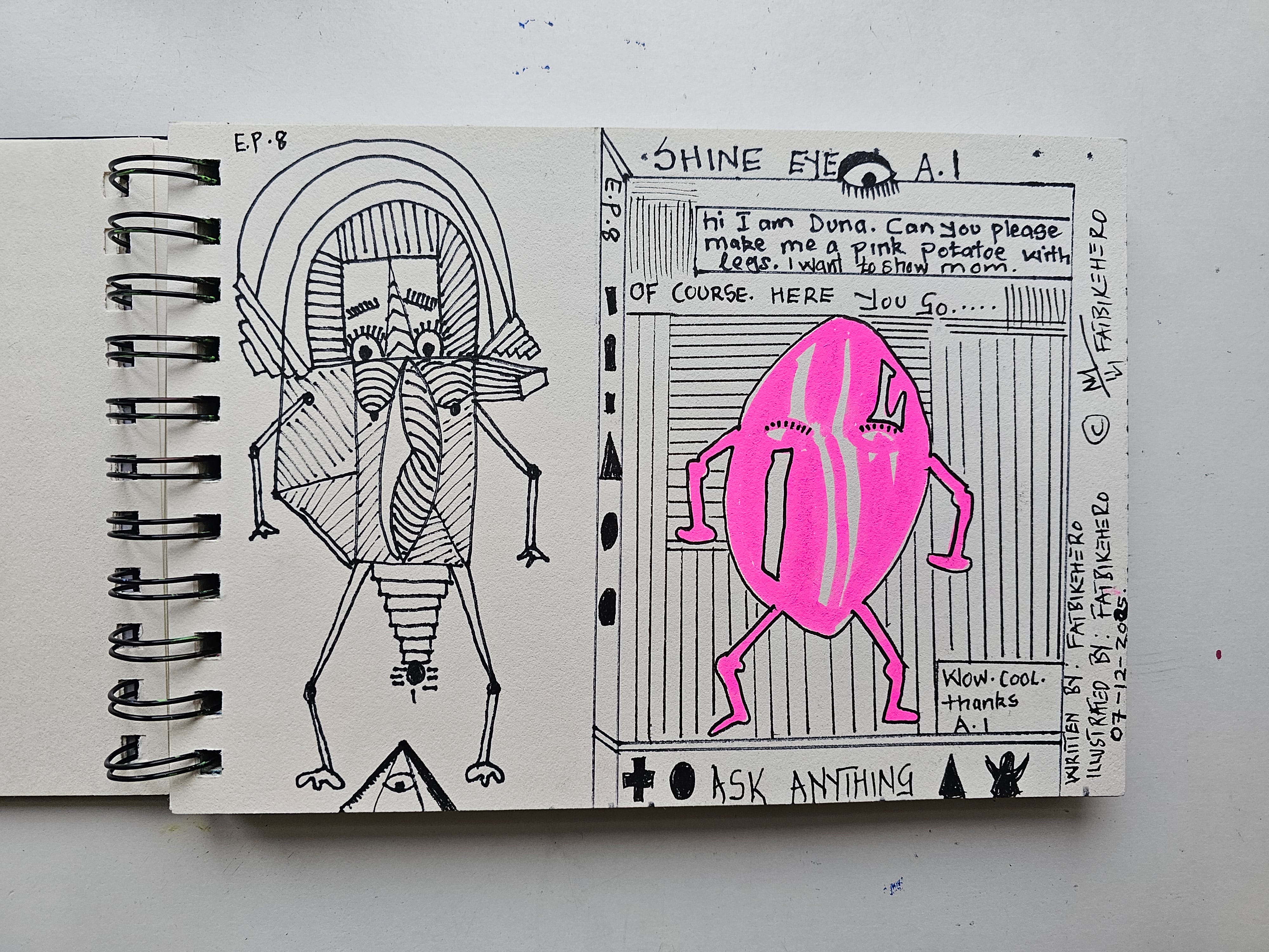 "Shine Eye A.I. Episode 8: The Pink Potatoe Paradox" is a disarming sketchbook diptych by FatbikeHero (b. 1983) that satirizes the generative AI loop. The work contrasts the austere, complex geometry of the "backend" intelligence with the absurdly simple, whimsical output demanded by human users—specifically a "pink potatoe with legs." It is a humorous yet profound commentary on how hyper-advanced technology is utilized for trivial, childlike amusement.